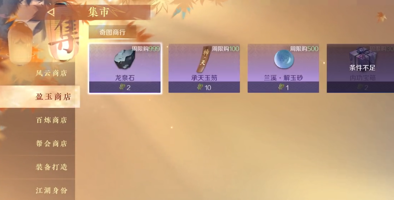 至于盈玉商店的话,里面的商品都是升级材料,例如装备的锻造材料,还有升级内功的秘籍等物品。都是前期培养角色需要用到的,只不过这些商品需要纹玉兑换,代价更高一些。百炼商店的话都是一些装备。这些装备都是紫色装,如果前期没有橙装的话,用这些也不错。