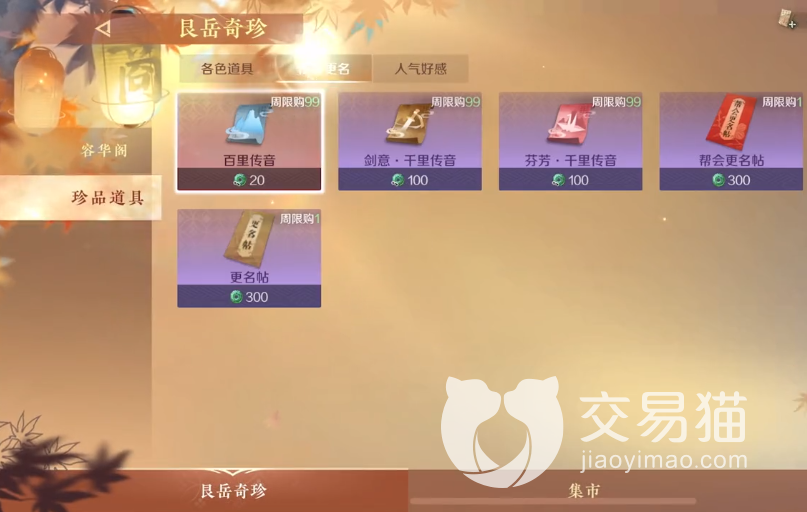 进入游戏主页后,大家可以点击右上方的奇珍,接着便会跳出集市的页面。继续点击集市便可进入,集市里面的商店很多。第一个就是风云商店,想要兑换里面的物品,就需要积攒风云令,风云令可以通过做活动、刷副本获得。