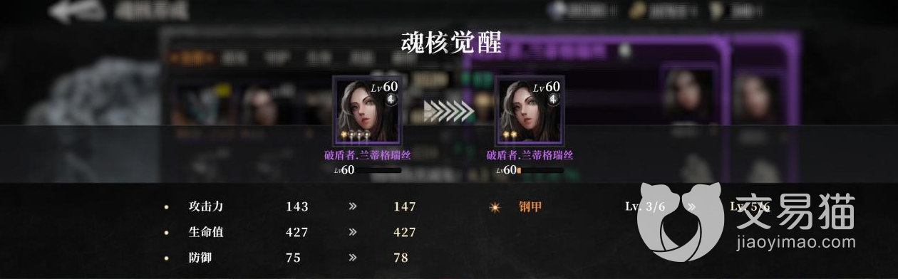 魂核的觉醒也比较被动,在魂核品质达到一定的星级之后,相同品质的同名魂核进行分解后就可以完成觉醒,魂核的星级是可以消耗一定的材料进行升级,属于魂核的养成部分。觉醒之后魂核的基本数值,等级上限都会大幅度更新,并且可以解锁相应的魂技以及牵绊点。玩家要将魂核的等级提升至5级才可以进行觉醒了,而且魂核觉醒一共有三个觉醒阶段,并且每个阶段分为三星,白魂核的初始觉醒阶段为一星、蓝色魂核二星、紫色魂核为三星,而我们的金色魂核直接可以达到一阶段的觉醒。