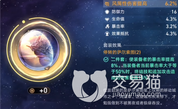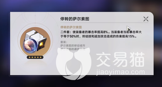 其实崩坏星穹铁道里不乏有四效装备的,二效装备反而不多,萨尔索图就是其中一个,但并不代表萨尔索图就差,只要强度够,只有两种效果的装备也能比四效强。萨尔索图主要分为两部分:晨昏界线及移动城市。前者是连结绳,后者是位面球。两者合二为一能使角色暴击率飙升8%。若这时角色暴击率到50%甚至超过,角色在释放终结追加技能攻击可使其伤害再提高15%,不愧是五星装备!