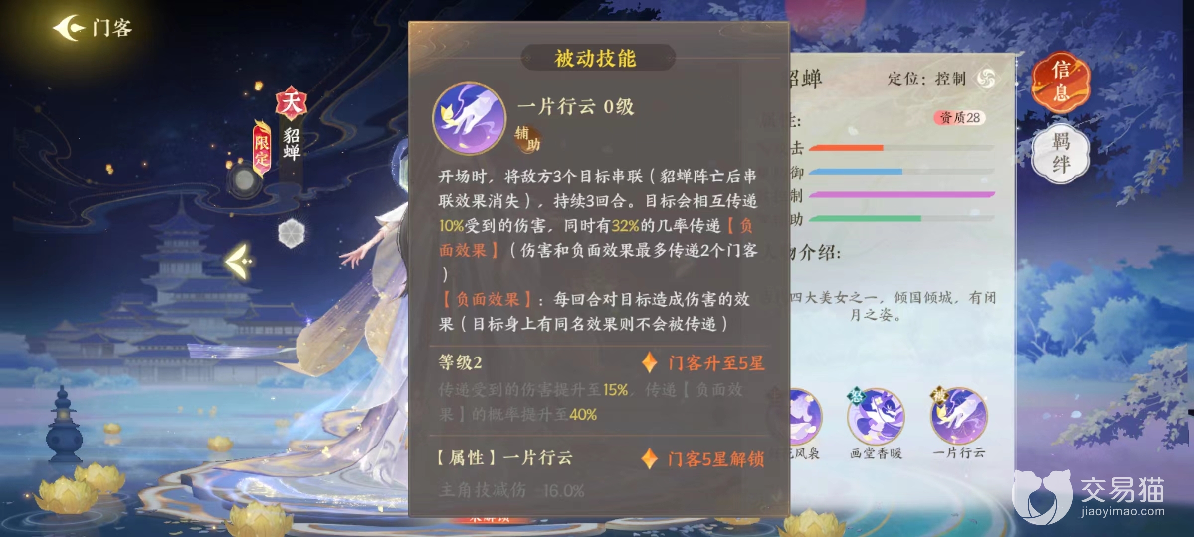 被动效果为开场之后,直接选择敌方三个目标串联起来,该效果或持续三个回合,或是在貂蝉阵亡后消失。被连起来的目标相互之间会传递受到的部分伤害,以及有几率传递受到的负面效果。这里负面效果就是能够对目标造成持续伤害的类型,包括各种不良状态等。就使得我方目标所施加的单一不良状态,有几率扩散到多名敌人身上。