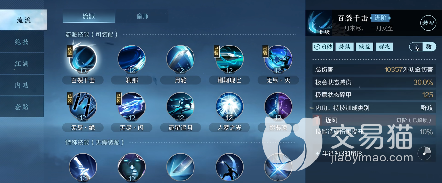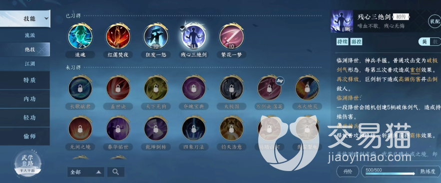 绝技加点:推荐主加“残心三绝剑”,它可以让角色的普攻施放剑气,不仅能打出更远距离的输出,而且之后还会附带重创和击倒效果,在持续输出和控制层面都可圈可点。剩下的点数可以优先升“狂发一怒”和“繁花一梦”,前者可以提高短期爆发,后者则也能制造不错的输出。