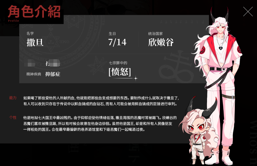 精神状态方面拥有抑郁症特征,撒旦个性暴躁,对应七宗罪里面的愤怒,生日是7月14日,统治国家欣嫩谷。