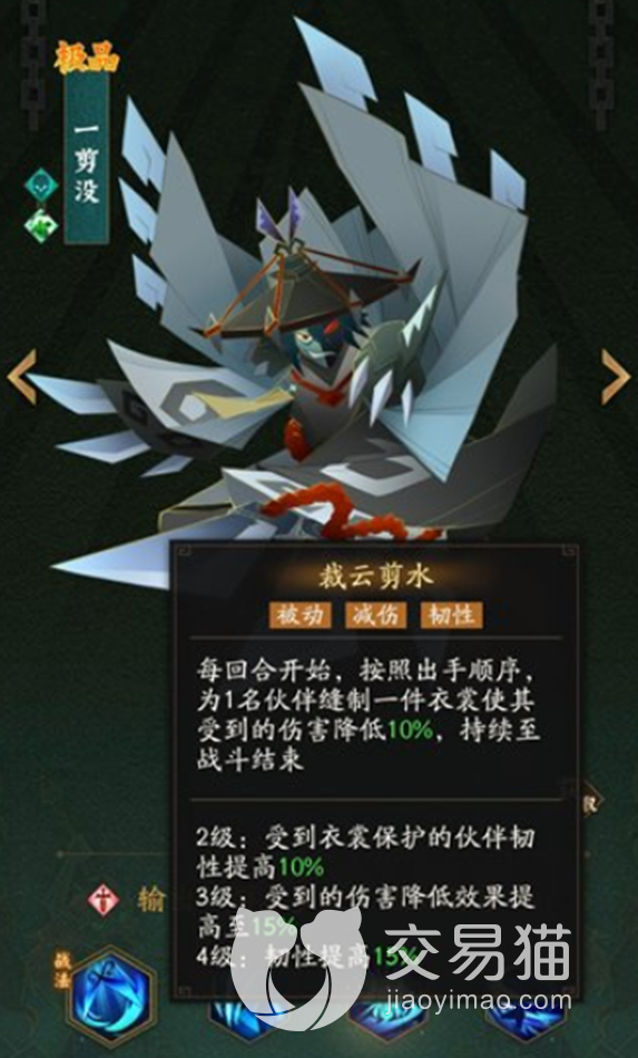 被动:裁云剪水,听起来就是一个合格的“裁缝”,这个技能在每回合的开始,按照大家角色的出场顺序,会为友方一名角色缝制一件在受到伤害的时候,降低10%伤害的衣服,并且会一直持续到战斗结束。