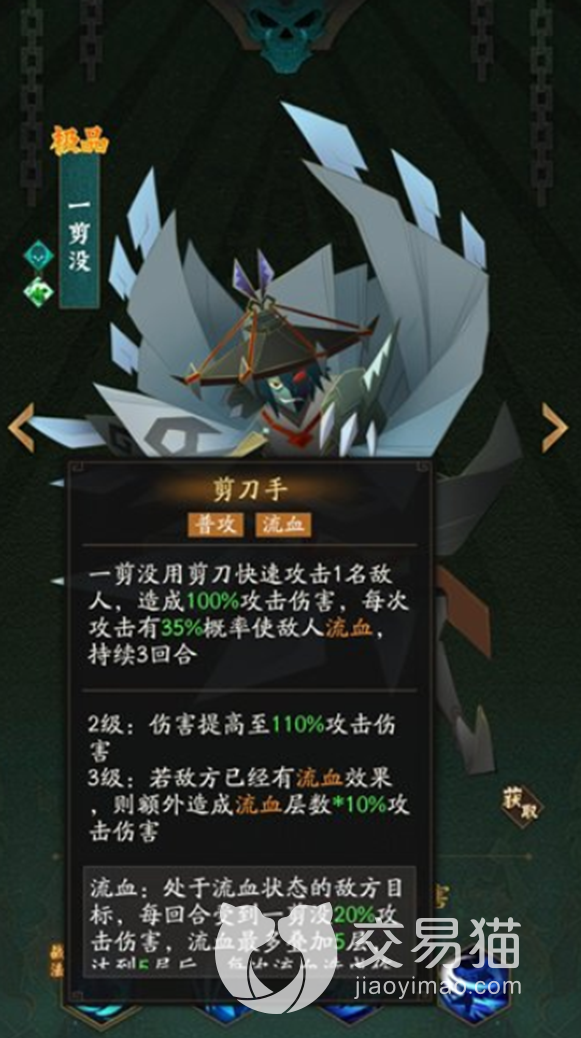 首先是一剪没的普通攻击:剪刀手,这可不是剪刀手爱德华那样温柔的剪刀手,一剪没的普攻可以快速攻击一名敌方角色造成伤害,同时每次攻击由35%的概率会给敌方造成流血的减益buff,buff会持续3个回合。