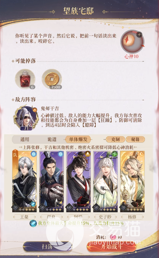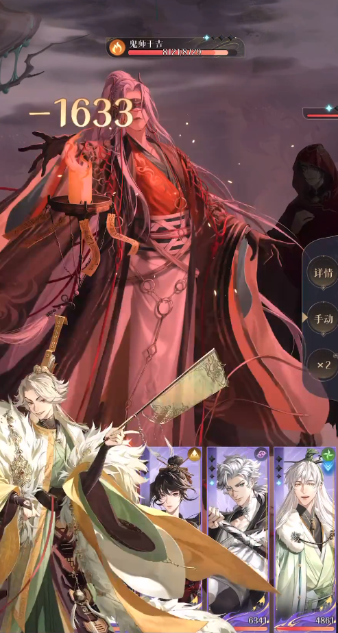 打法思路:第1回合先打干吉,如果第1回合能秒掉,那么后两回合就打护法,如果玩家使用的是拥有追击效果的阿蝉,记得最后一下让阿蝉收割。第4回合干吉第1次复活,全部队员继续集火干吉,尤其是没有洗过命盘的杨修,大招可以留在第4回合可以放,尽量一回合清理干吉,其他队员除奶妈以外下拉防御套盾扛过一回合大招。后续回合重复1~4回合步骤,8~9回合即可结束战斗。