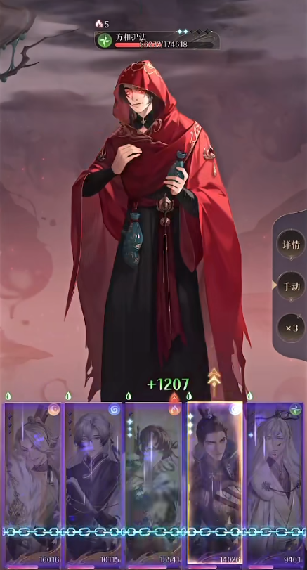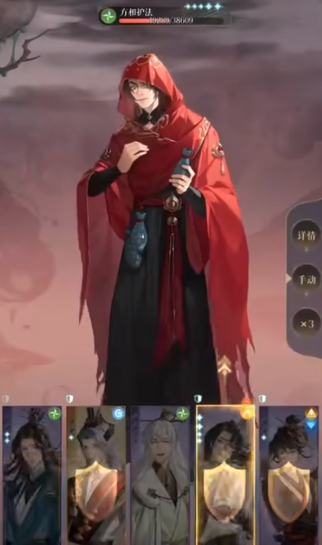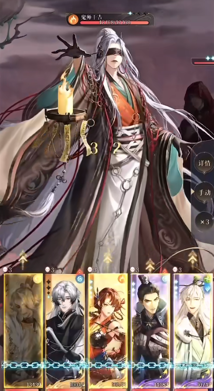 打法思路:前期不要防御,进攻就是最好的防守,迅速4回合全员进入臆障状态。第4回合干吉要复活继续打干吉,之后集火方相护法。后面回合按照4回合一个轮次重复,有王粲的链条不容易挂。