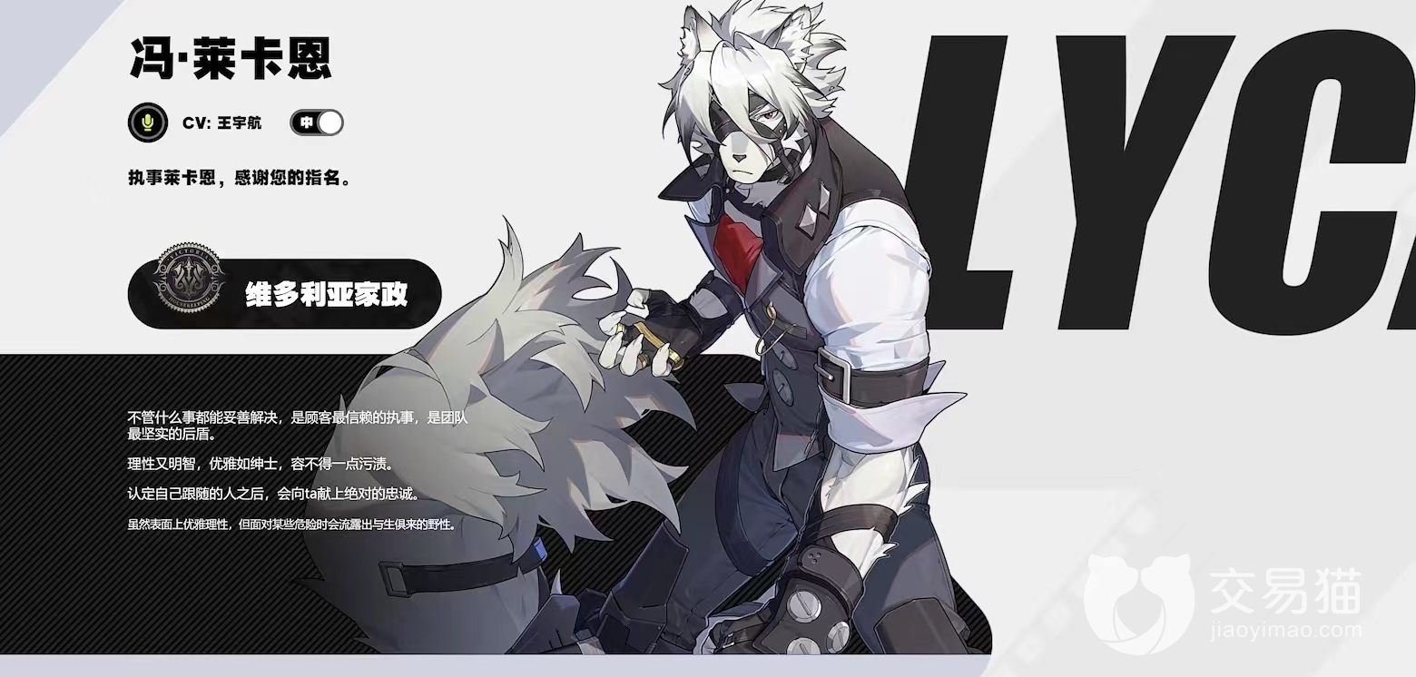 冯莱卡恩这个角色它的外形给大家展现出来的是一个狼的形状,并且是隶属于维多利亚家政公司的,他这个人做事情是比较干脆果断的,在战斗执行力这一方面也是比较强,并且他可以做到,只要有任务,绝对能完成,总之这个角色在游戏里面给人的形象就是举止优雅,做事果断的一个执事。