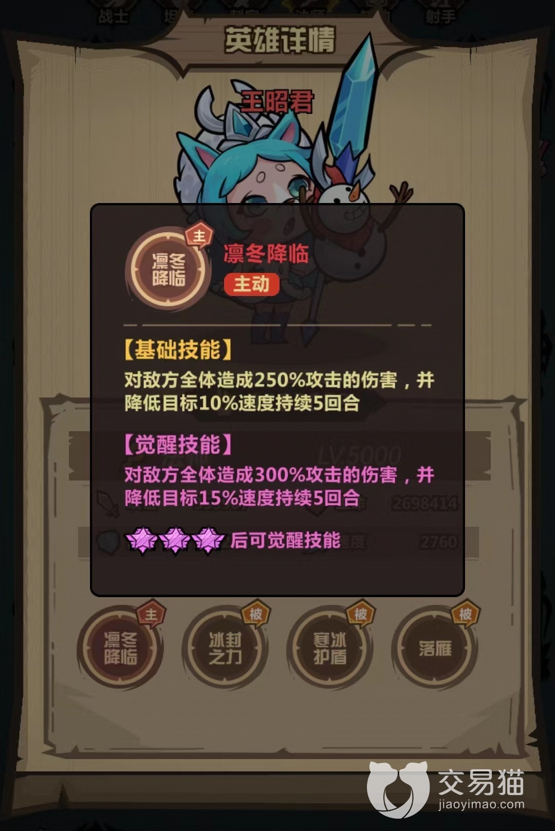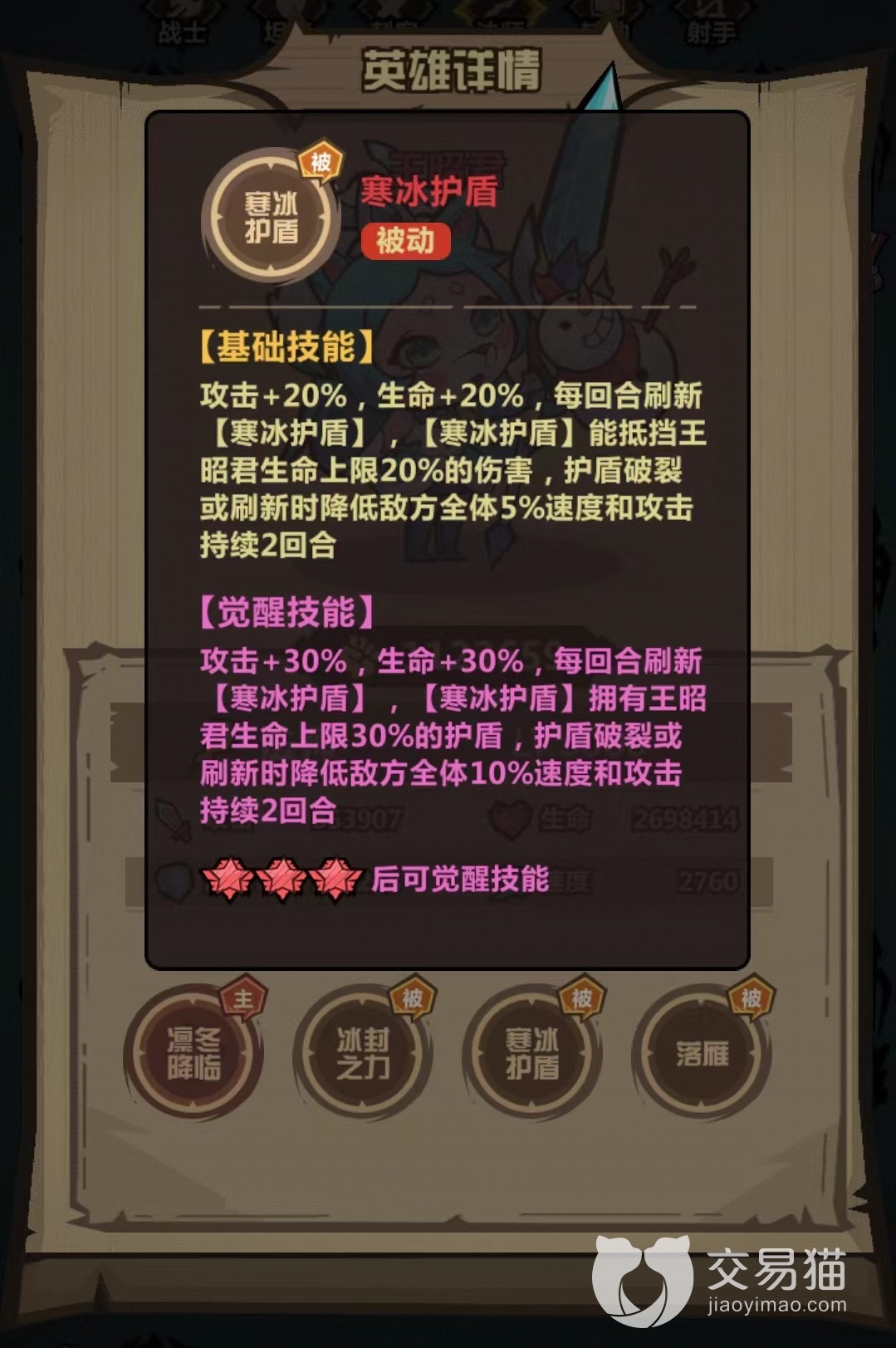第1个被动冰封之力,自身普攻有几率使目标进入冰冻状态,一旦被冰住,将在两回合之内无法进行任何行动。虽然攻击目标不可手动选择,但只要能成功触发冰冻,住就相当于减少了对方一名角色输出,也是很好用的控制效果。第2个被动寒冰护盾,觉醒之后能提升30%攻击力和生命值,这样在生存和输出上都有了很大提升,在每回合都会刷新自己身上寒冰护盾。