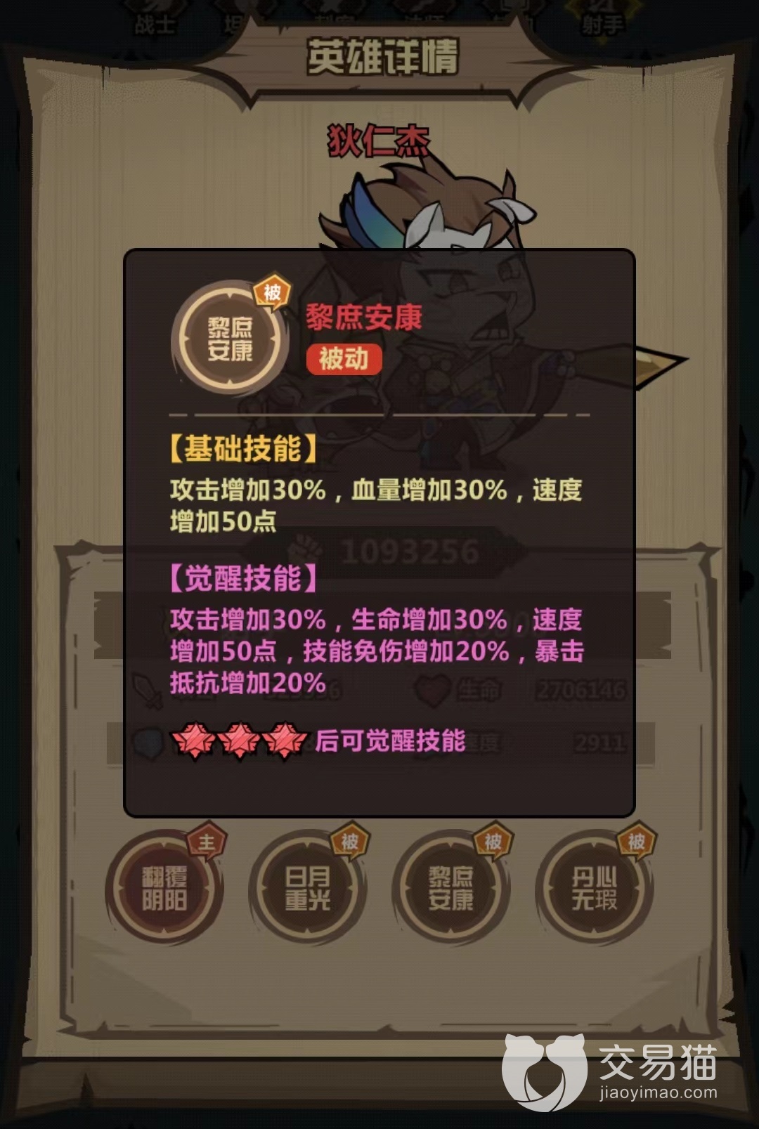 第1个被动日月同光,每当敌人被眩晕控制时,就能恢复自身生命值,当敌人被冰冻时,自身提高攻击力持续三个回合,被灼烧时则能随机降低一名敌人身上的免伤属性,这是游戏中非常独特的被动效果。第2个被动黎庶安康,主要提升该角色攻击力和血量以及速度,并且对技能免伤和暴击抵抗也有提升,属于偏向生存能力方面效果,但是提高速度这点非常关键,能够在对战中有着更好的表现。