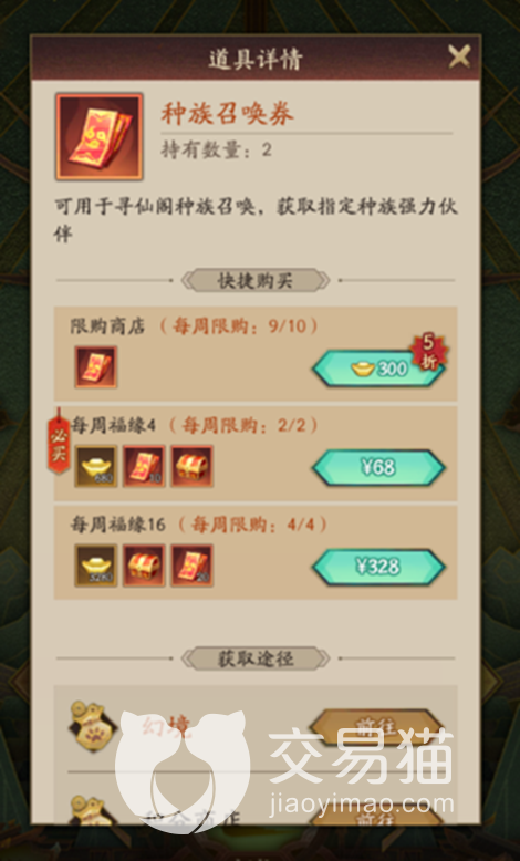第二个就是种族召唤券,这一个召唤券可以在高级召唤券的基础上指定想要获得的种族来进行召唤,而且获取的途径也比较多,积分商店、幻境、限购商店、每周福缘,想要获得天月的大家千万不能错过每周的福缘袋哦。