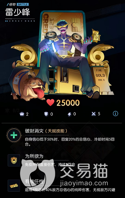 第二章最难的就是2-23的挑战了,怪物有免疫和回血,可以点击怪物的属性面板查看。建议手动进行挑战,第一回合先不要用主角技能,等雷少峰释放免疫的时候,我们再注意使用带有驱散类的卡牌进行挑战,比如白鸥的卡牌,后面就注意进行合理的攻击就好,最好信心等达到25000再去挑战,成功率会更高。