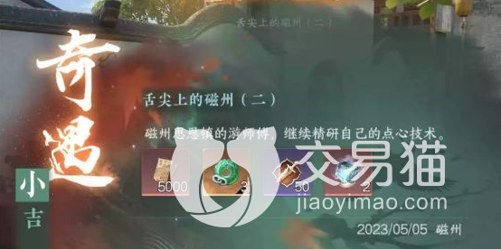 新出炉的点心大家可以走剧情,跟游师傅一起品尝一口之后,达到精研的效果,这样舌尖上的磁州二就算是完成了,完成之后获取的奖励跟一的奖励是一模一样的,随后大家不要走开紧接着就可以触发三啦。