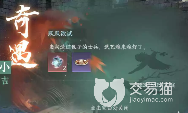 跃跃欲试这个奇遇是一个非常简短的奇遇,不需要大家费心思去触发,只要完成相应的动作就可以达到完成的目标,不过对于大家触发的要求是需要提前完成的,最好是在前面的主线都做完了,解锁雁门关地址之后去完成这个奇遇。