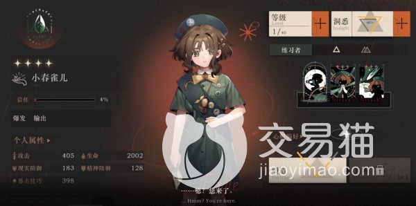 小春雀儿的一技能往日怀表是一个状态特化技能,若是敌人身上有属性削弱、状态异常、控制状态,那小春雀儿除了能对敌人直接造成技能伤害外,还会额外附加一段攻击,并且在该技能三星,前后两段的攻击倍率分别为450%和100%,这也让小春雀儿一个技能的总伤倍率达到了550%,在游戏所有角色的小技能伤害中都能名列前茅。
