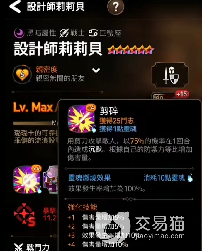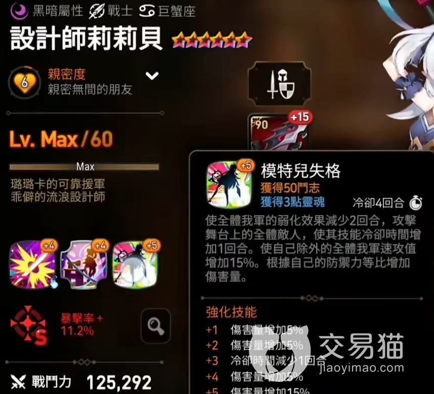 首先,莉莉贝的属性是十分强悍的,是非常稀有的暗属性。这个属性不仅克制版本非常火热的光属性,而且还可以削弱敌方属性羁绊组成的光环。当这个角色达到五星的时候,900多的攻击与600多的防御对于战士来说是十分均衡的属性。7056的生命处于中等偏下,106的速度处于中等偏上。从属性来看,这个英雄是一个很均衡的战士。