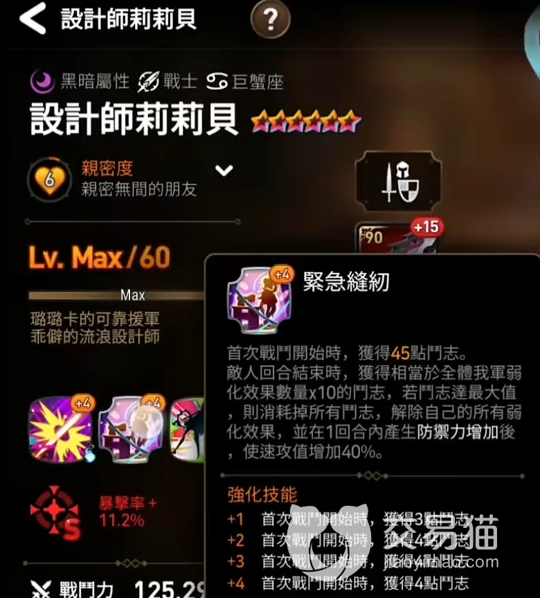 一技能剪碎可以让敌人沉默,是一个比较强势的控制技能。二技能紧急缝纫是一个很强力的先手技能。这个技能可以让设计师登场就有30点的斗志,这样一来就可以优先放出技能或者大招,打出先手控制,克制敌人的核心c位。