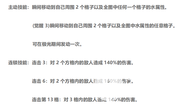 在技能方面,哒哒在觉醒之后是可以增强自身已有的技能状态的,哒哒主技能的移动范围会从原来的两格扩大到全图中的任意水属性格子,并且在极光期间还会额外发动一次技能,增强了技能的实战能力。所以若是小伙伴们想要寻找一个水属性的转化,那么哒哒无疑是十分适合的,不需要小伙伴们额外操心哒哒的安全问题,哒哒会自己跑。