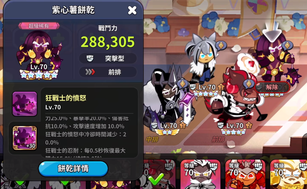 紫心薯饼干:拥有像龙卷风一样的群体范围伤害技能,战斗开始每15秒获得狂战士增益效果,攻击力、暴击率与攻速都有提升。