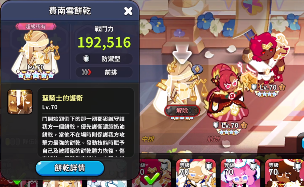 费南雪饼干:圣骑士的护卫,优先防御浓缩奶油饼干,如果没有这个角色,则保护队伍中攻击力最强的饼干,发动技能后赋予自身与被保护的饼干,体力恢复与抵抗,伤害抵抗暴击,增加攻击力等的增益效果。
