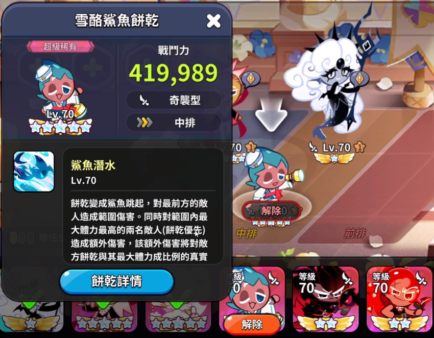 雪酪鲨鱼: 技能造成群体范围伤害,对于体力值最高的两名敌人造成额外的伤害,并且对最大体力值比例的造成真伤。不过这个角色容易跳空技能,比如在打冰霜饼干时,两方同时放动画大招,雪酪鲨鱼技能有延迟就会钻空。