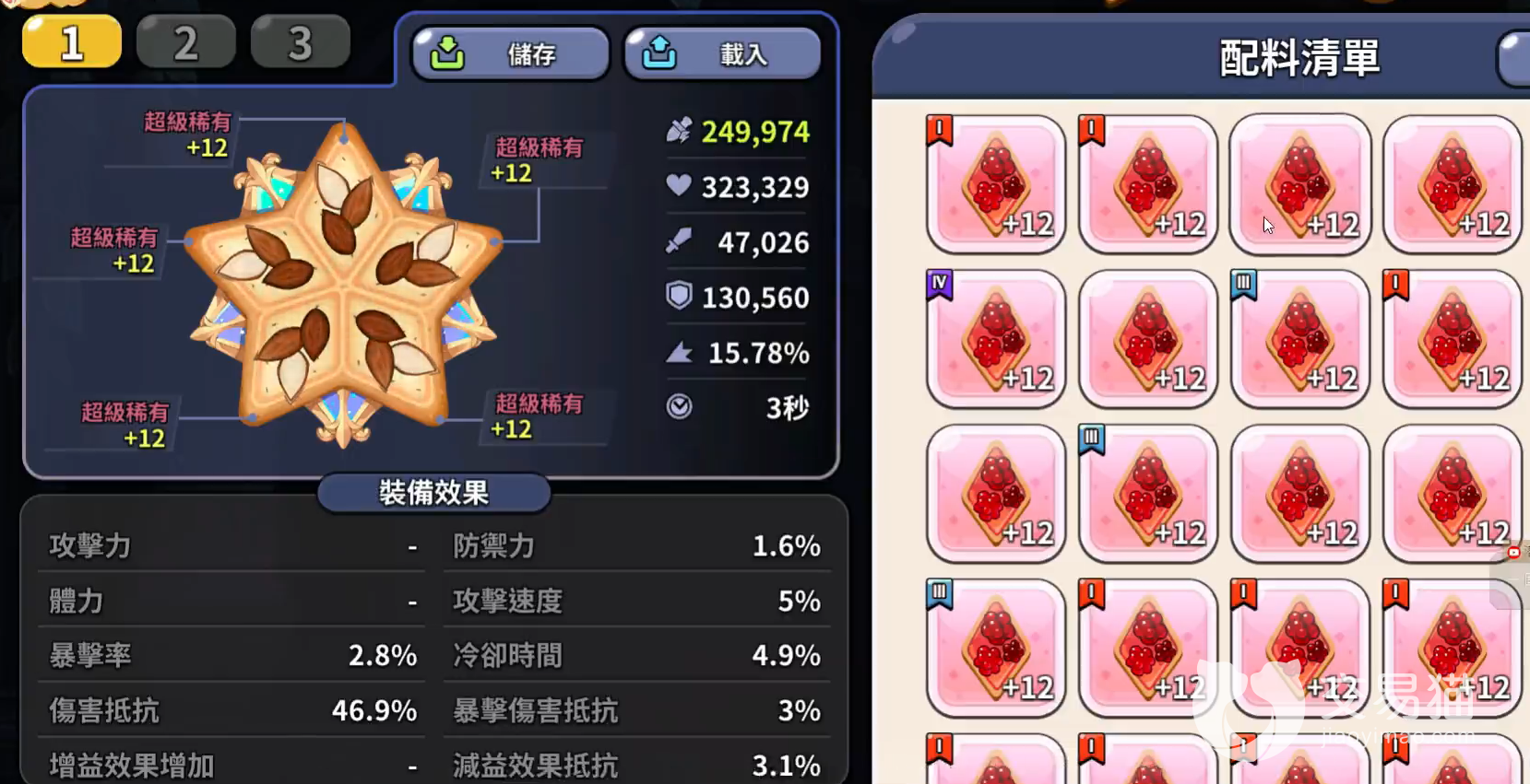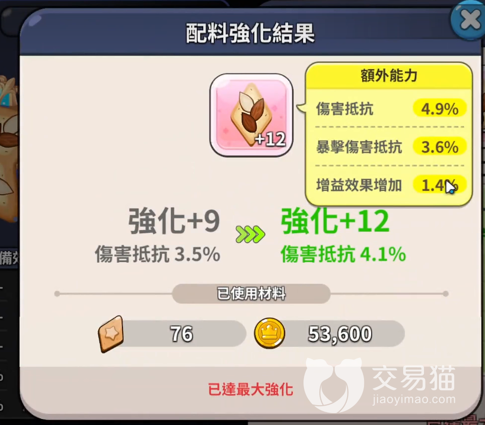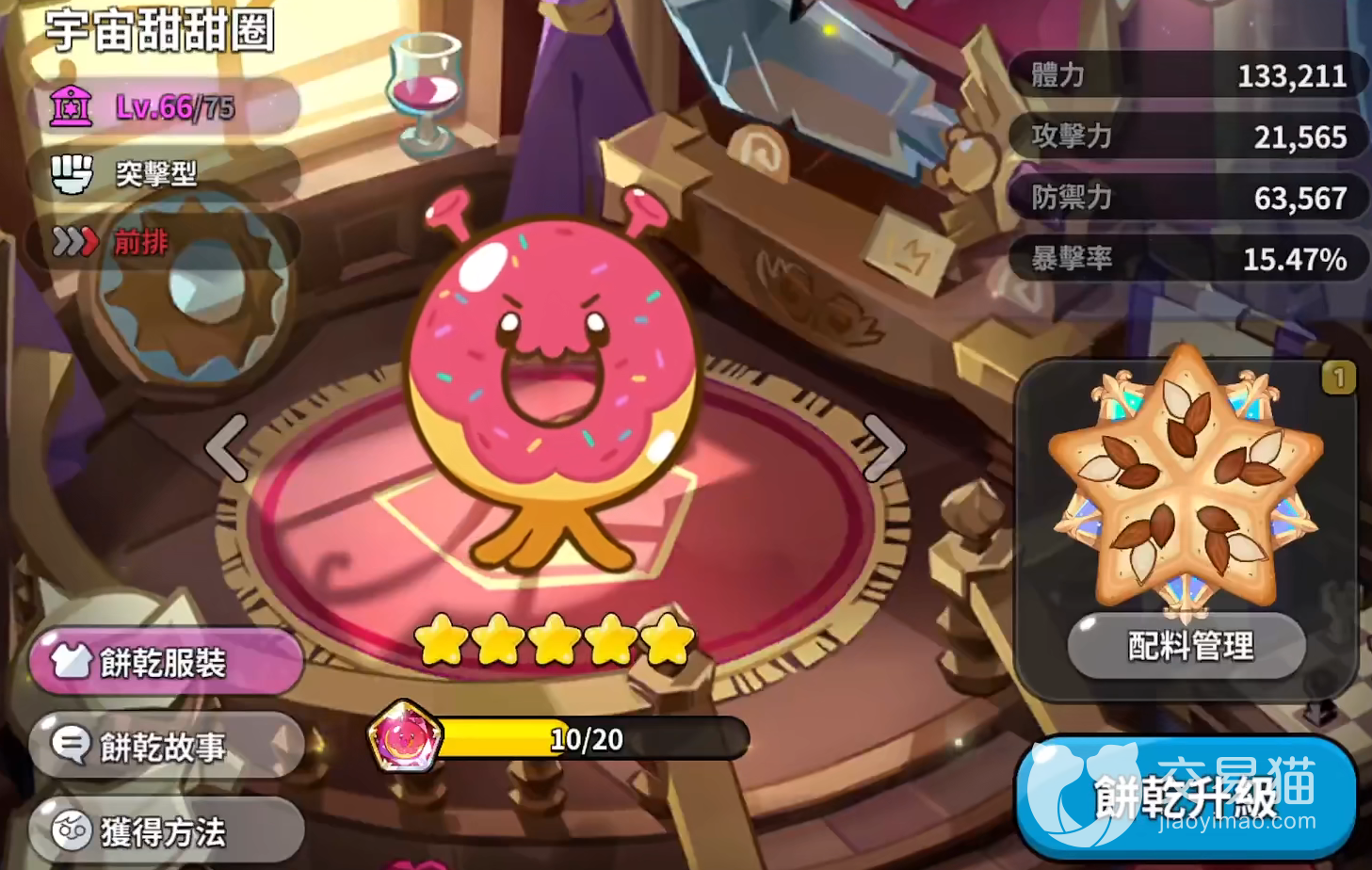 配料在同类型游戏中可以理解为装备,提升饼干人的各项属性,每位饼干人可以带5个位置的配料,配料上会写明各类属性:攻击力、防御力、暴击、减伤、攻速等等,这里大家应该能理解了,想要5个位置全部解锁需要达到30级。