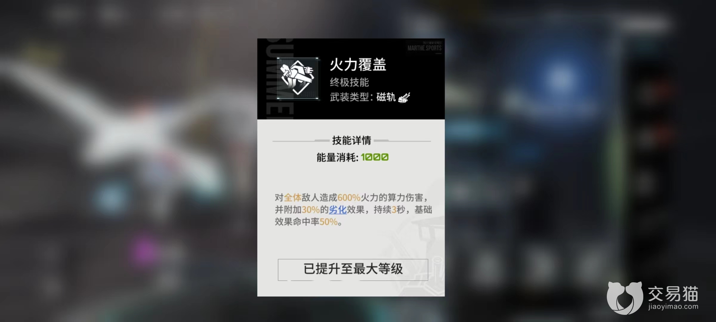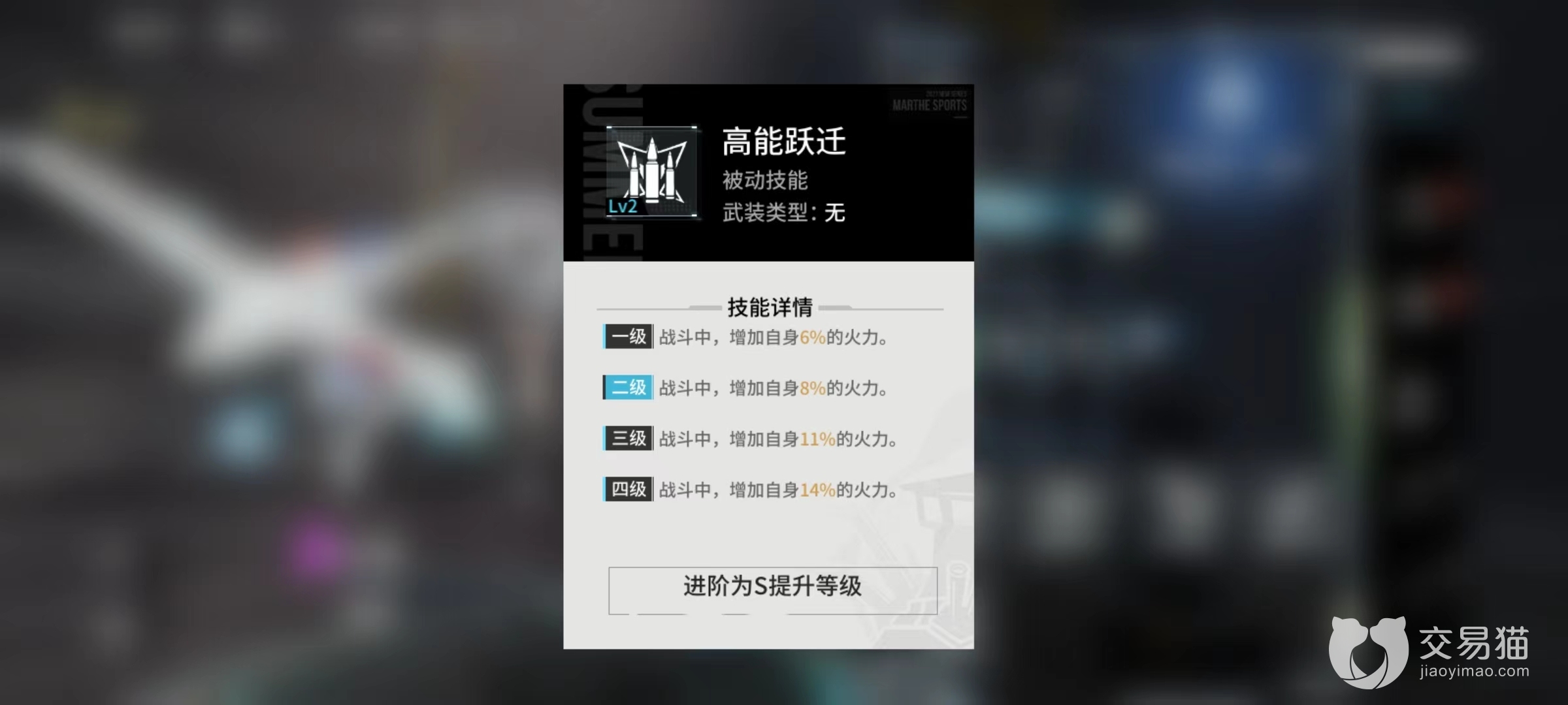 固有技能是单纯单体伤害,冷却时间18秒钟,相比于其他角色的输出技能,并没有太大的优势,冷却时间也偏长。唯一一个被动高能跃迁,战斗时提高自身最多14%火力属性,也是突击型机体标配。从各技能效果来看,最关键地方就在于终极技能所提供的劣化,这才是重要伤害输出来源,而且是除了自己打伤害之外,其他队友也能享受到削弱之后带来的提升。