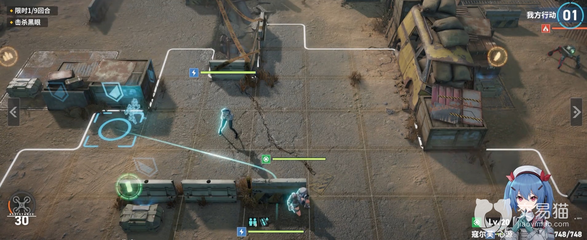 战斗开始时,玩家可以先安排佩里缇亚靠近黑眼,站在离黑眼最近的一个掩体后面,方便她进行攻击,而闪电去打好兵,这时候闪电可以一招把好兵给打死掉,接着酒是由敌方行动,敌方的黑眼会选择去攻击我方的寇尔芙与克罗丽科。到了我方回合后,先让寇尔芙去打敌方的侦察兵,再让闪电与佩里缇亚一起打黑眼。之后,黑眼会对佩里缇亚进行攻击,此时寇尔芙来回血治疗,敌方的好兵和侦察兵都会围到黑眼的身边,那么闪电要持续攻击,克罗丽科就负责去进行扫射,把敌方的侦察兵和好兵全部清理掉,这样子,就可以让三个输出在最后的时候可以集中火力应对黑眼。