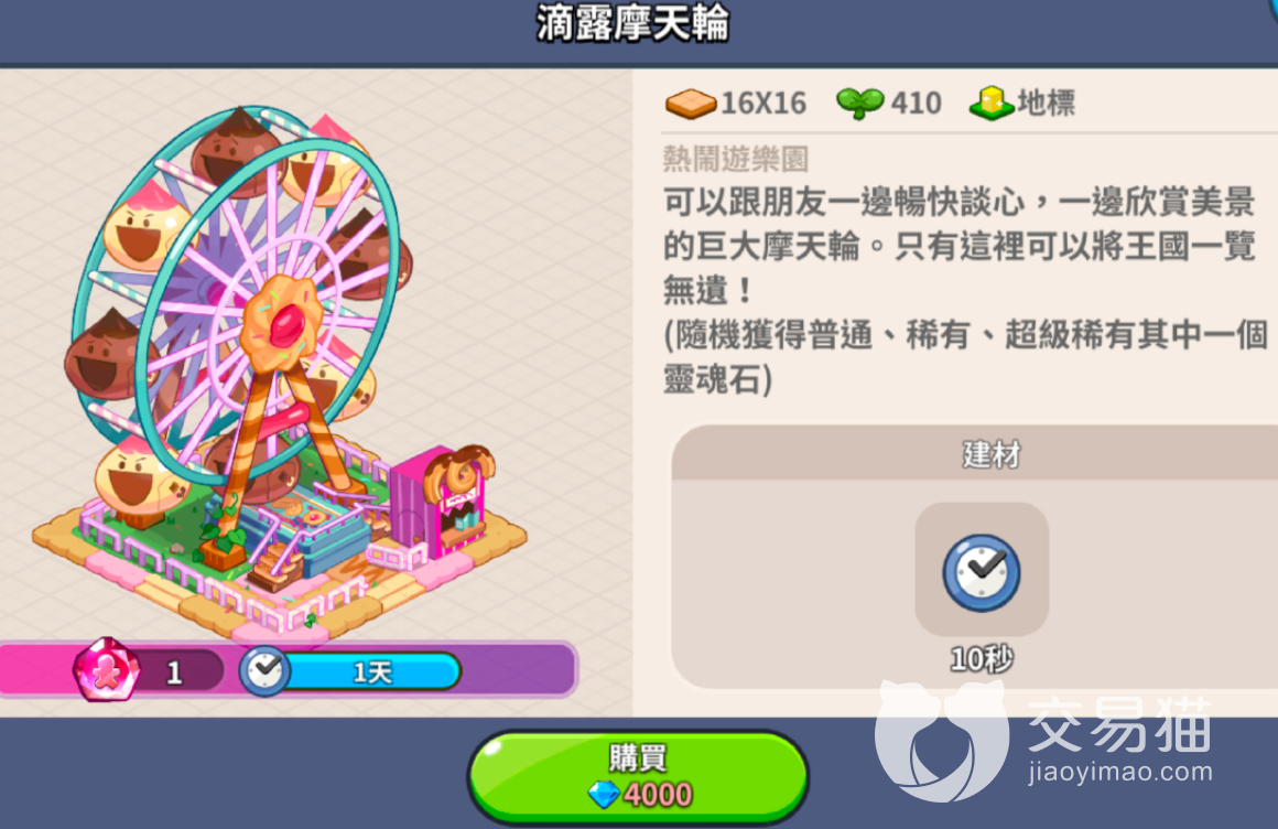 摩天轮:可以一边与朋友畅快谈心,一边欣赏美景的巨大摩天轮,效果是可以每天随机获得普通、稀有、超级稀有其中一个灵魂石。对于资源不够的新手玩家来说,前期可以先跳过不买。