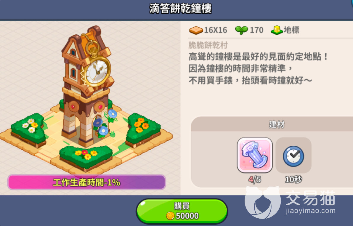 饼干钟塔:初始玩家必提前做的饼干钟楼,外形较为简约,效果是工作生产时间减1%。