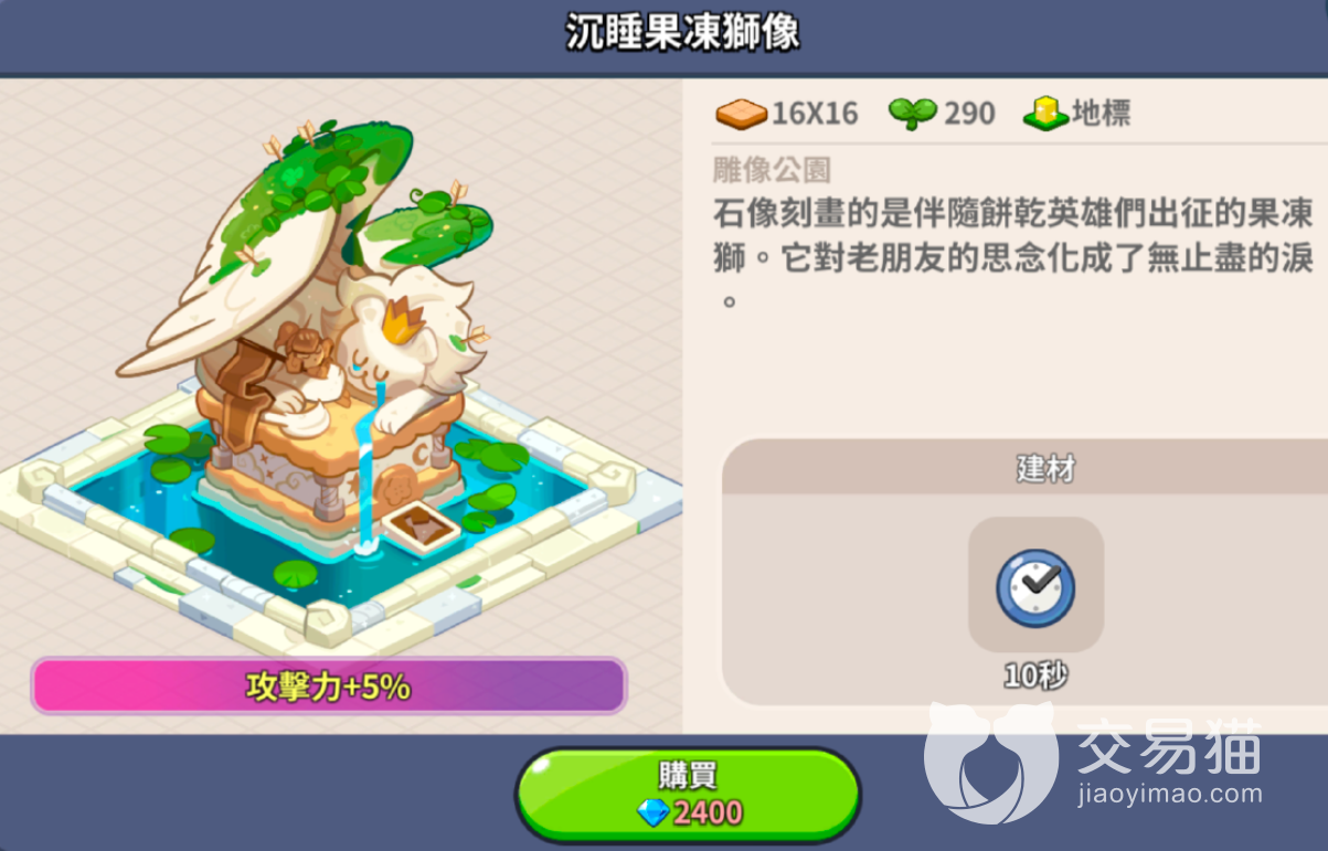 果冻睡狮子像:石像刻画伴随着饼干英雄出征的果冻狮,效果是增加攻击力5%,建造消耗2400钻石,还是比较值得的。