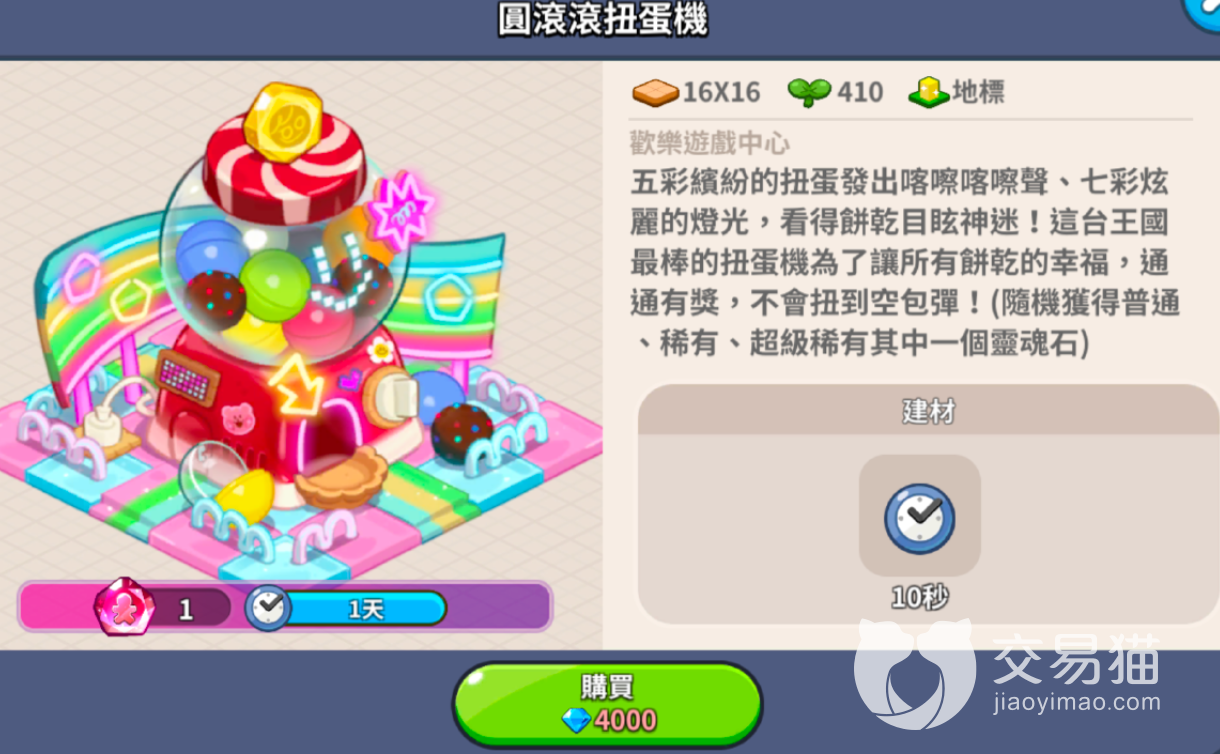 扭蛋机:五彩缤纷扭蛋机机器,每次扭蛋必有奖励,不会抽到空包弹,每天随机获取普通、稀有、超级稀有其中的一个灵魂石,新手玩家不急着开,建筑优先度较后。