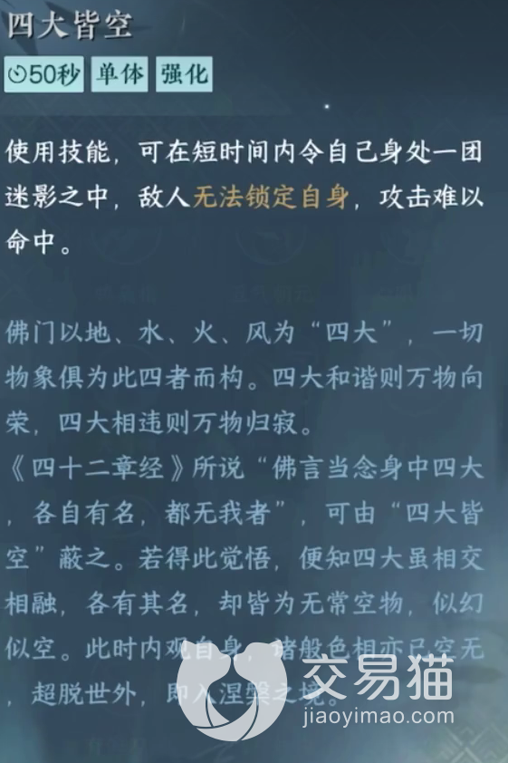而四大皆空武学是一个很不错的单体强化技能。50秒的冷却,但单体强化能力很不错,使用技能后可以在短时间内让自己处在一个迷雾当中,算是一个半隐形状态。敌人无法锁定自身,攻击力无法释放出来,让敌人攻击难以命中。相当好用,各类型流程环境下都能用得上。