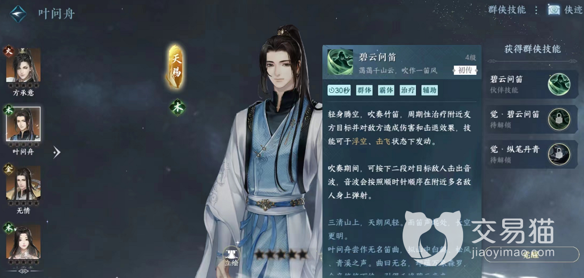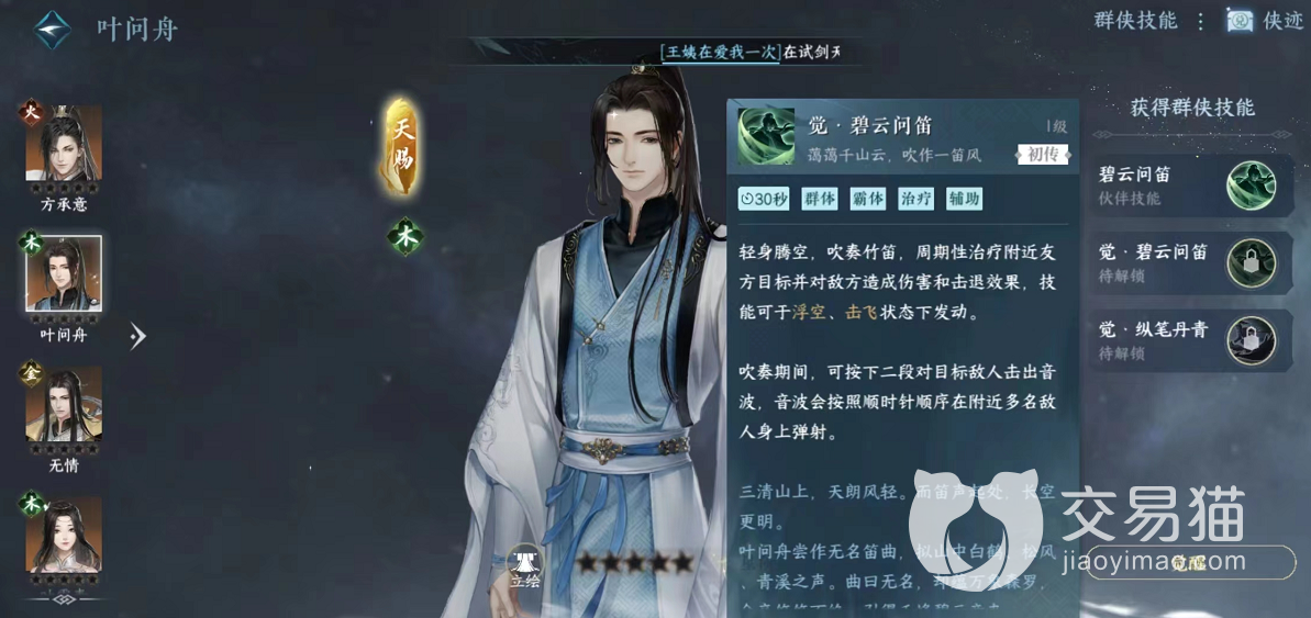 游戏内的伙伴分为不同的品质,而叶问舟作为其中最高品质天赐伙伴中的一员,也将为我们提供非常强大的输出以及辅助能力。他在游戏内的定位是群体辅助治疗,相当于队伍中的奶妈,可以帮助玩家们快速的恢复自身的血量,拥有一定的续航能力。这个角色拥有三个技能,首先第一个技能为碧云问笛,这个技能拥有30秒的冷却时间,属于一个群体辅助型技能,可以轻身腾空,在空中吹奏竹笛,周期性的为附近的友方目标恢复血量并且对敌方单位造成伤害,同时还拥有一定的击退效果,能够更好的保障队伍的实力,而且还能在浮空和击飞状态下发动这个技能,没有任何限制。