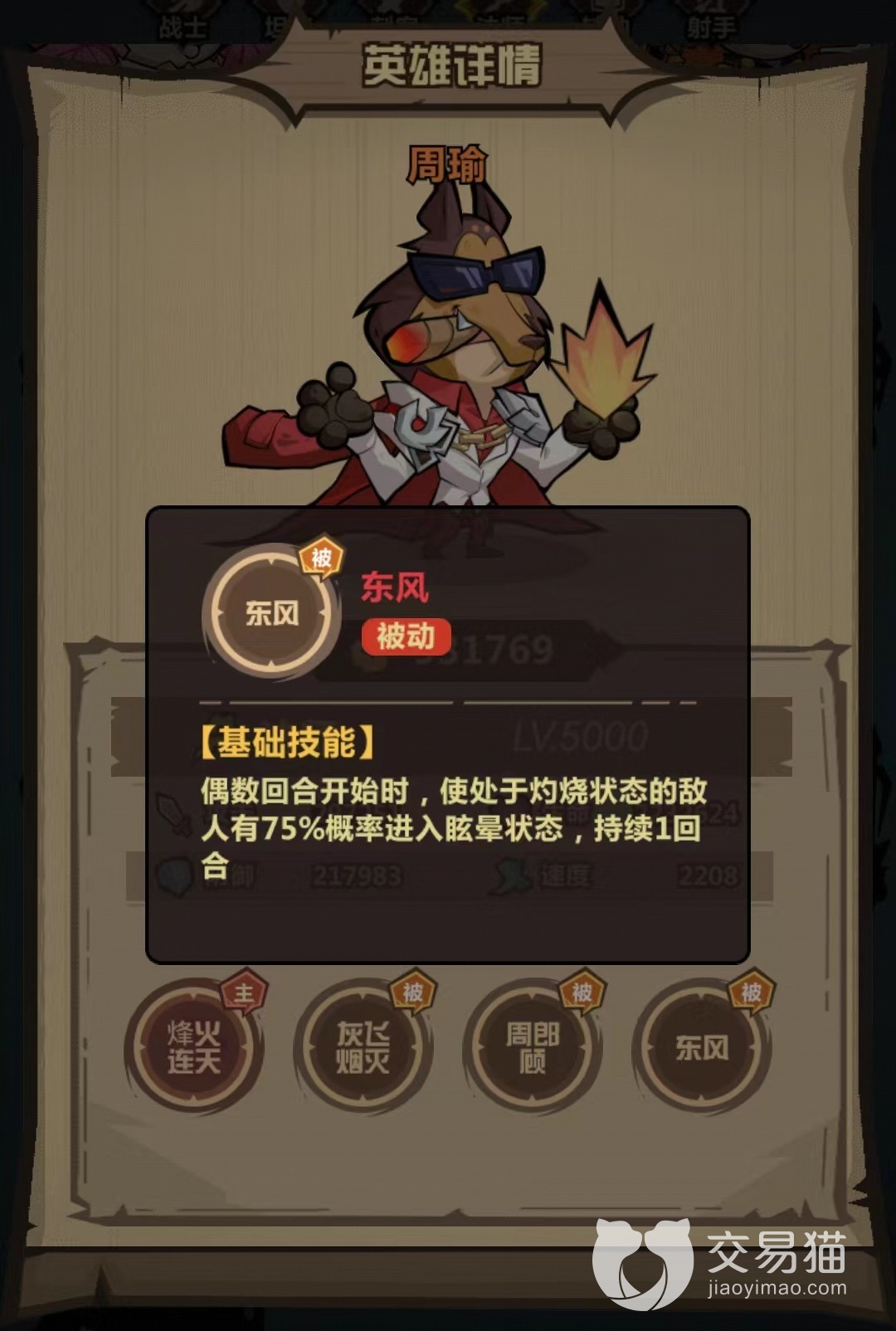 最后一个被动东风,当偶数回合数开始时,如果敌人有处于灼烧状态的目标,则有75%几率进入眩晕状态,持续一回合。一定要注意是在偶数回合才会生效,而且几率相当高,这样就具有了比较出色的控制能力,不再只能依靠灼烧来打输出。周瑜作为法师是非常称职的,既拥有较强群体输出能力,加上出色灼烧持续伤害,还拥有了控制效果,满足了成为一名强势法师的必要条件。