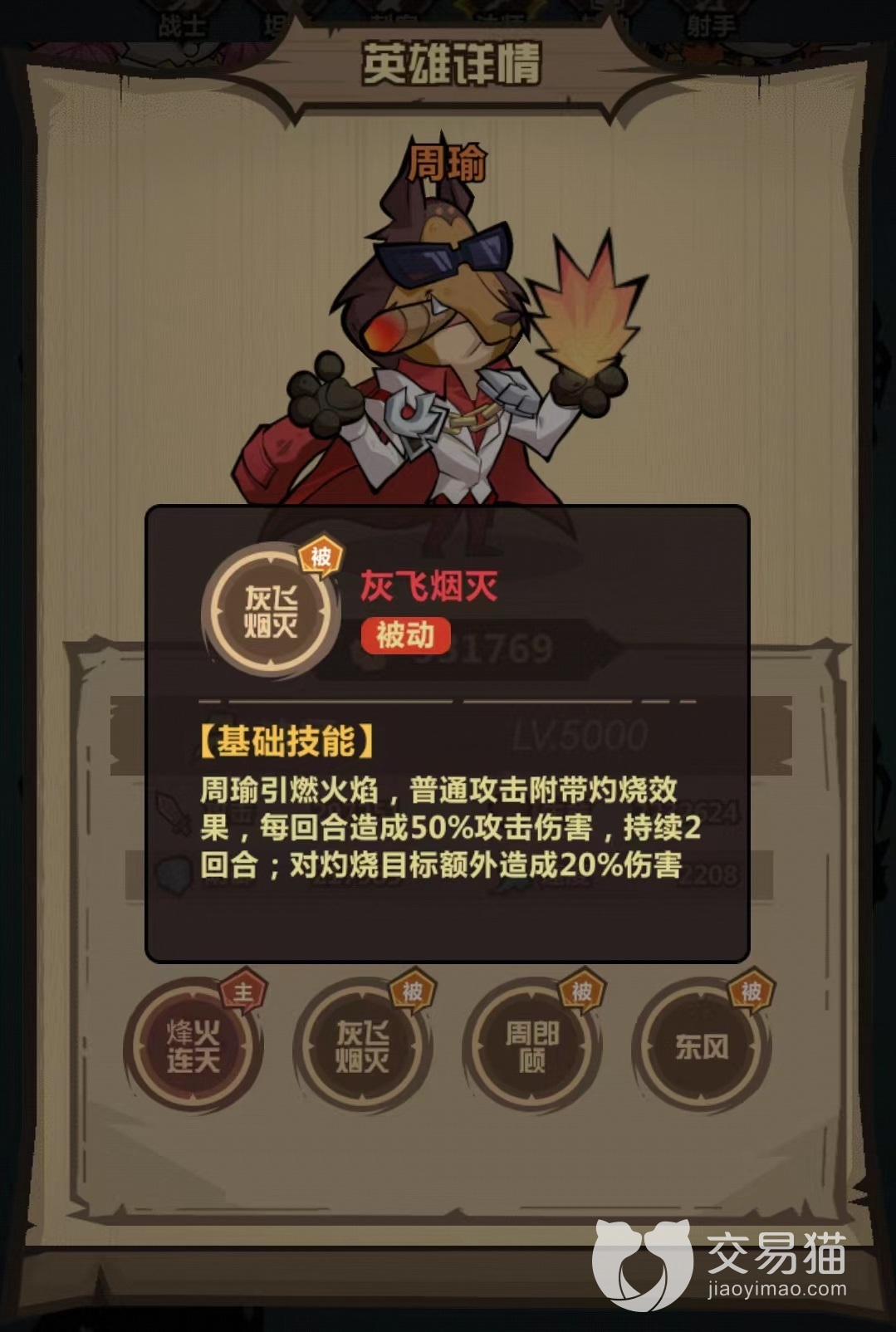 第1个被动灰飞烟灭,引燃火焰使自己普通攻击也附带灼烧效果,在每个回合造成50%攻击力数值伤害,持续两个回合。如果输出目标已经被灼烧,则在计算伤害时候有20%额外加成。第2个被动周郎顾,提升自身20%生命值,在受到攻击时有几率使攻击者进入灼烧状态,这一次附加灼烧和上面完全相同,持续回合数也一样,这样一来该状态附加机会将大大提高。