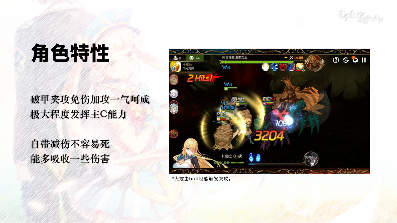 卡密拉作为游戏中第二批出场的三星角色,攻击属性是游戏中比较少见的光属性,同时身为战士角色在初始状态就拥有800的攻击力以及4500的生命值,相比于其他角色卡密拉可以担任非常多的功能,不仅可以在团队中担任坦克前排,同时也可以承担输出的位置。同时卡密拉的技能也十分的强力。