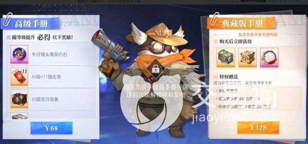 其价格为68元,打开可以获得牛仔猫头鹰契约石,60级的强化券,11张55级的史诗装备,还有粉色装备徽记袋。这其中,牛仔猫头鹰它是游戏中一个比较强的宠物了,而且在外形设计上带着一丝可爱又有一种帅酷的感觉,值得推荐。