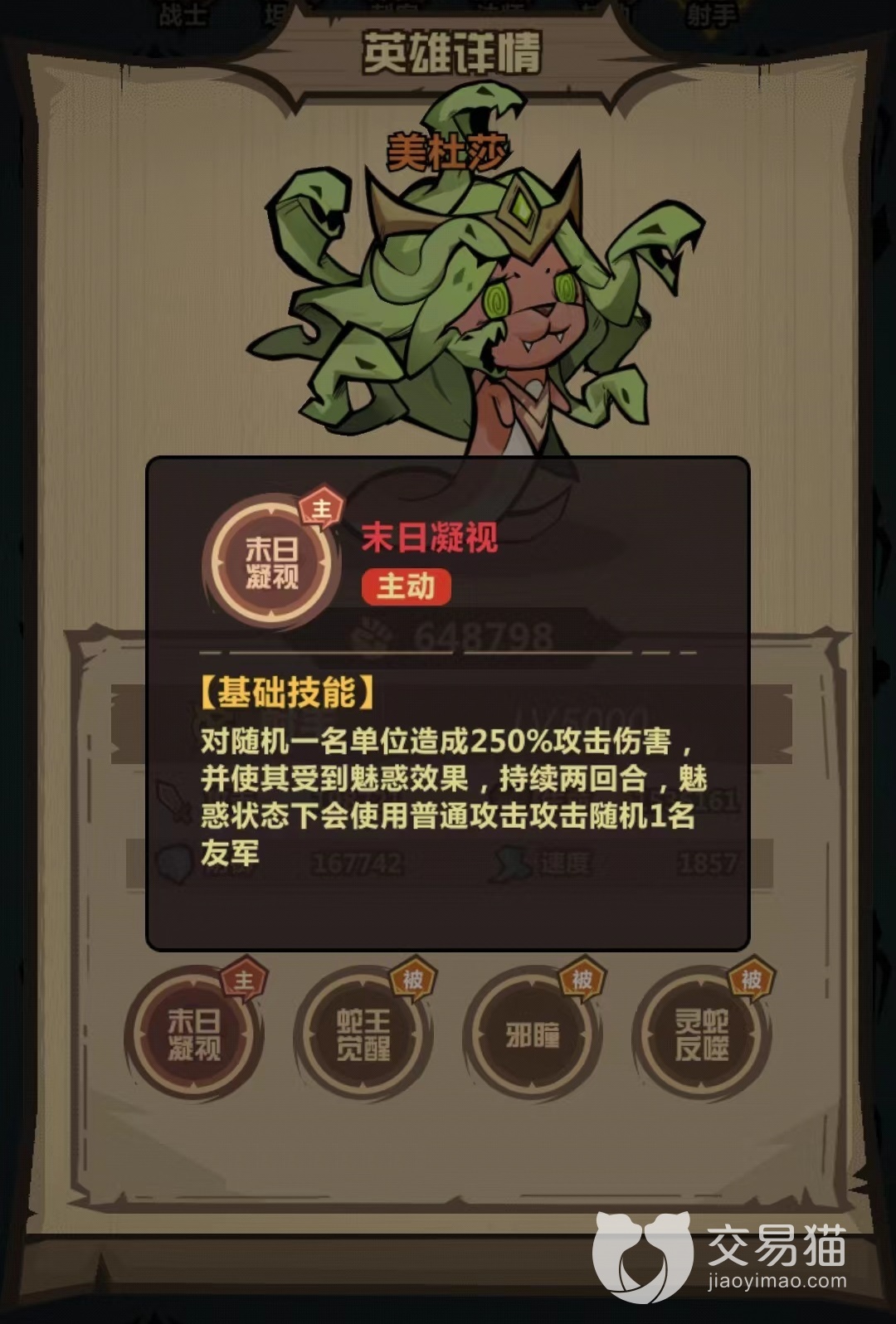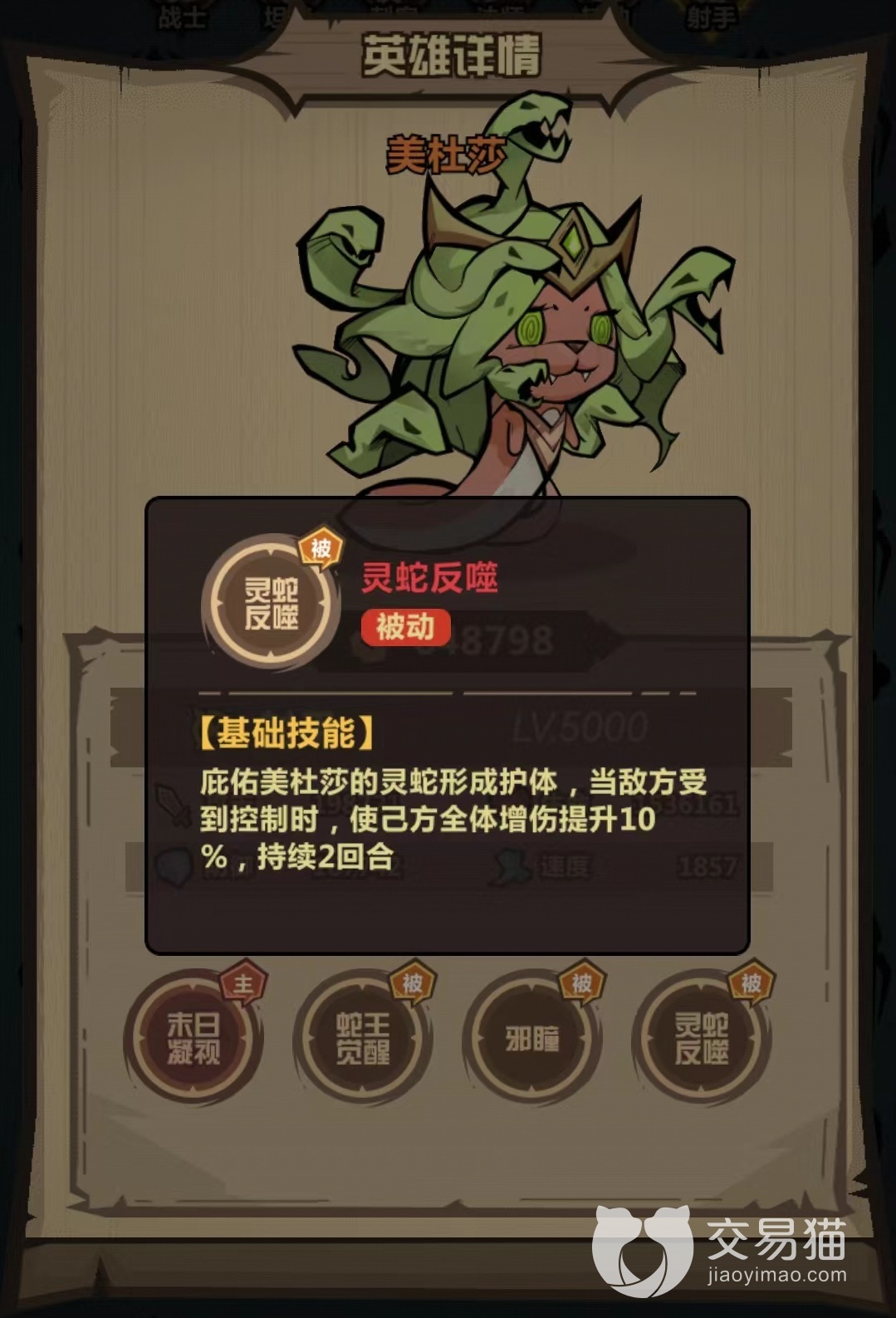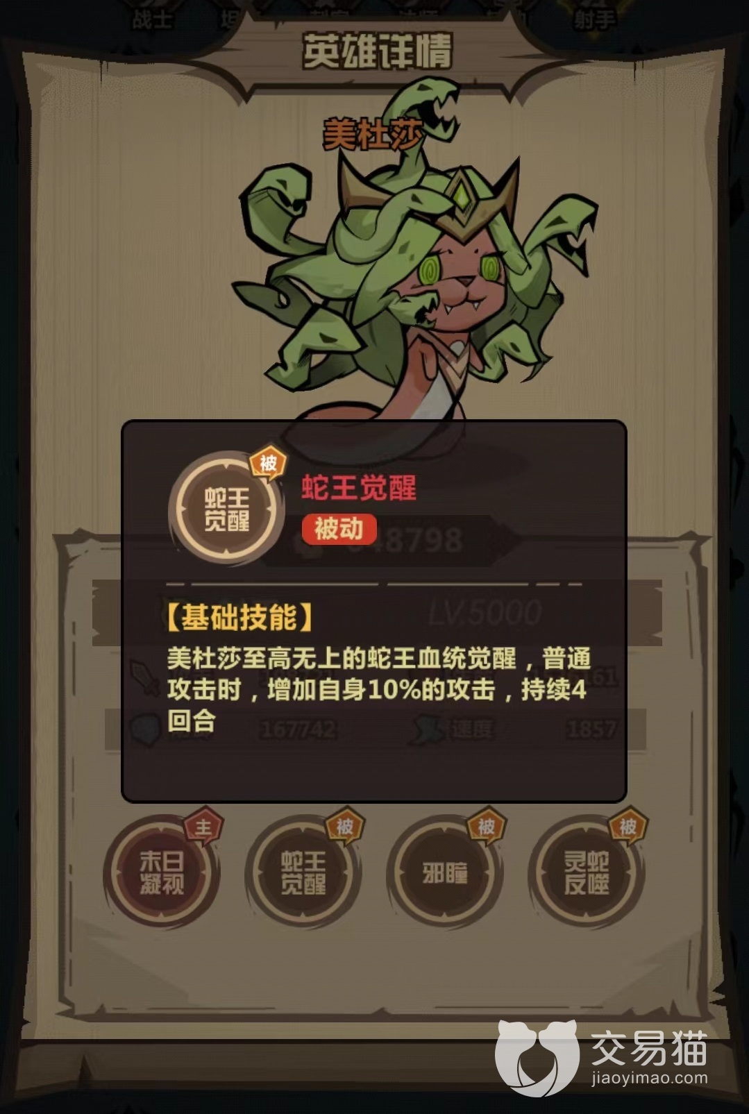 成功魅惑之后,对方不仅仅损失了一回合输出,还会攻击自己人造成比较可观的伤害。第一个被动蛇王觉醒,美杜莎身上蛇王血统觉醒,在普通攻击时能够提升自身10%攻击力,持续4个回合。因为本身主动技能伤害并不算高,所以提高10%攻击力以后也不算是太过明显。