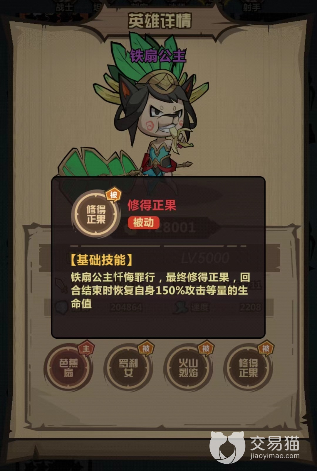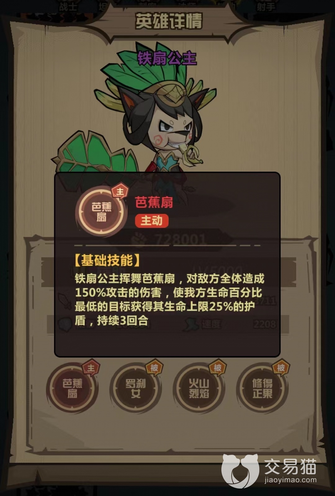 对于铁扇公主这样紫色品质武将来说,因为后期乏力,所以只能在前期发挥出作用,尤其是在开荒阶段,这就要依靠自身技能效果。主动技能芭蕉扇,挥舞芭蕉扇对敌方全体造成伤害,同时选定我方血量百分比最低目标,使其获得护盾,持续三个回合。护盾厚度和施法目标生命上限相关,对方血量越高护盾也就越厚。此技能从伤害来看中规中矩,但是能添加护盾是团队中比较需要的属性。