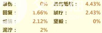 三级战斗属性即为7种天赋,除了暴伤和暴伤抵抗外均为自动触发。坚毅是提高存活率,血条剩小于一半时受到的伤害降低一定比值。回复是开启第五个回合时回复一定比值的生命。禁疗是不让对方回血回复,减弱对方的效果,100%时对方完全无法使用这两种属性。绝情相当于“趁火打劫”,敌方血条少于一半时自身伤害变高。泥泞顾名思义让对方陷进“泥”里,对方敏捷度降低。