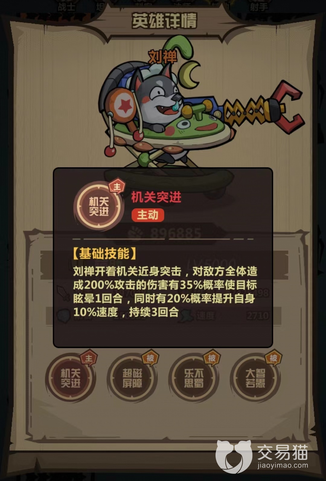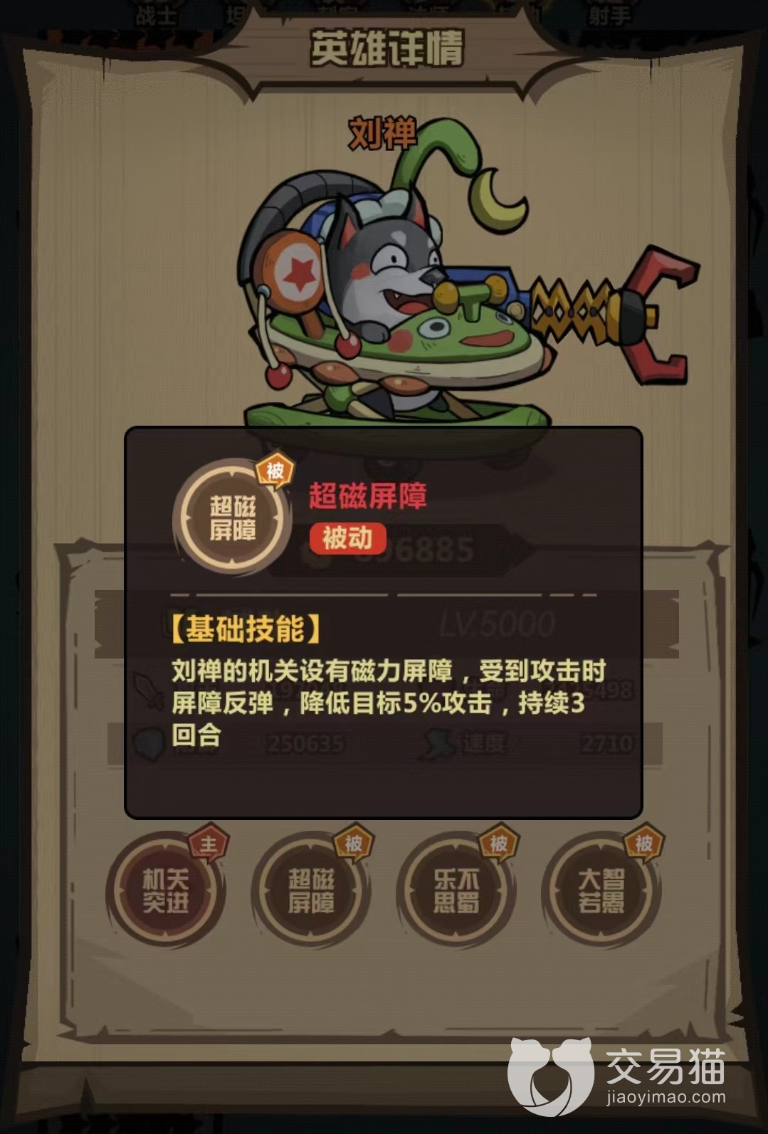 第一个被动超磁屏障,刘禅机关上带有磁力屏障,在受到攻击时能触发反弹,降低目标5%攻击力,持续三个回合。虽然降低的数值比较低,但是触发目标却很多,只要攻击刘禅的敌人都会受到这样的影响。这样累积起来,对削弱敌方输出也是有很好的作用。第二个被动乐不思蜀,向敌方发动攻击,使普通攻击变成随机伤害一名敌人,同时造成攻击伤害提高还能使目标眩晕一回合。