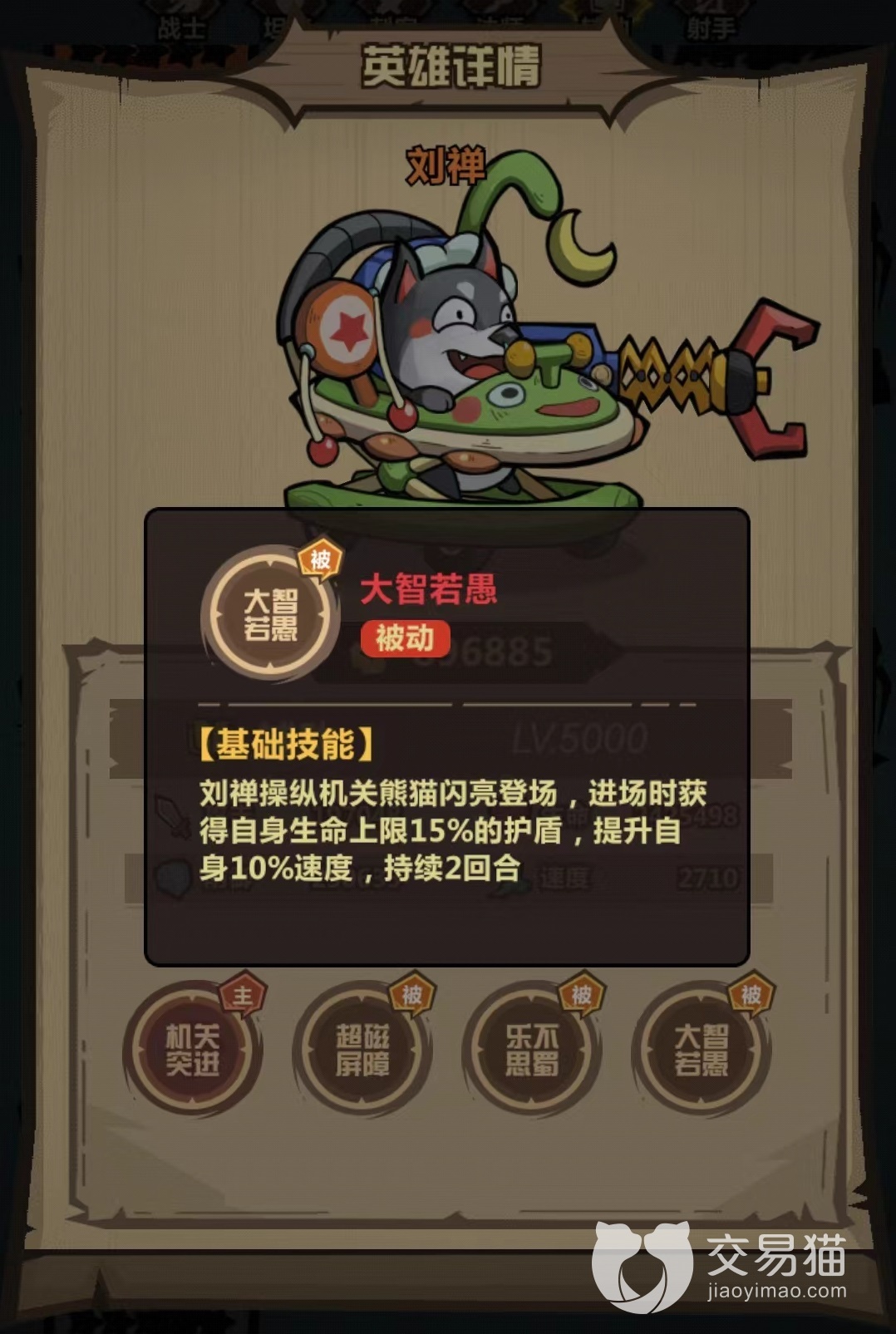 这里的眩晕就没有了被动,而是必定生效,才是刘禅最关键的强硬控制。第3个被动大智若愚,操纵机关熊猫闪亮登场,在开战进场时就能直接获得护盾,护盾厚度由自身生命上限15%来计算。后期血量越多,护盾也会随之提高,所以不会过时。同时还能提升自身10%速度持续两个回合,提升速度就使得刘禅能占据先手位置。