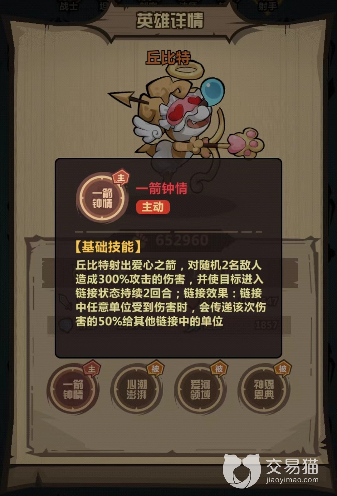 主动技能一箭钟情,丘比特射出手中的爱心之箭伤害对方随机两名敌人,再造成300%攻击数值伤害之后,使得两个目标进入到链接状态。链接效果能持续两个回合,再持续时间之内,被连接的两个人任意一个受到伤害时,都会将受到的50%伤害转给链接中其他单位。该技能只连接两个人,所以相互之间就可以进行传递,如果能将两名比较脆皮的敌人连接起来,将会加快我方清除的速度。