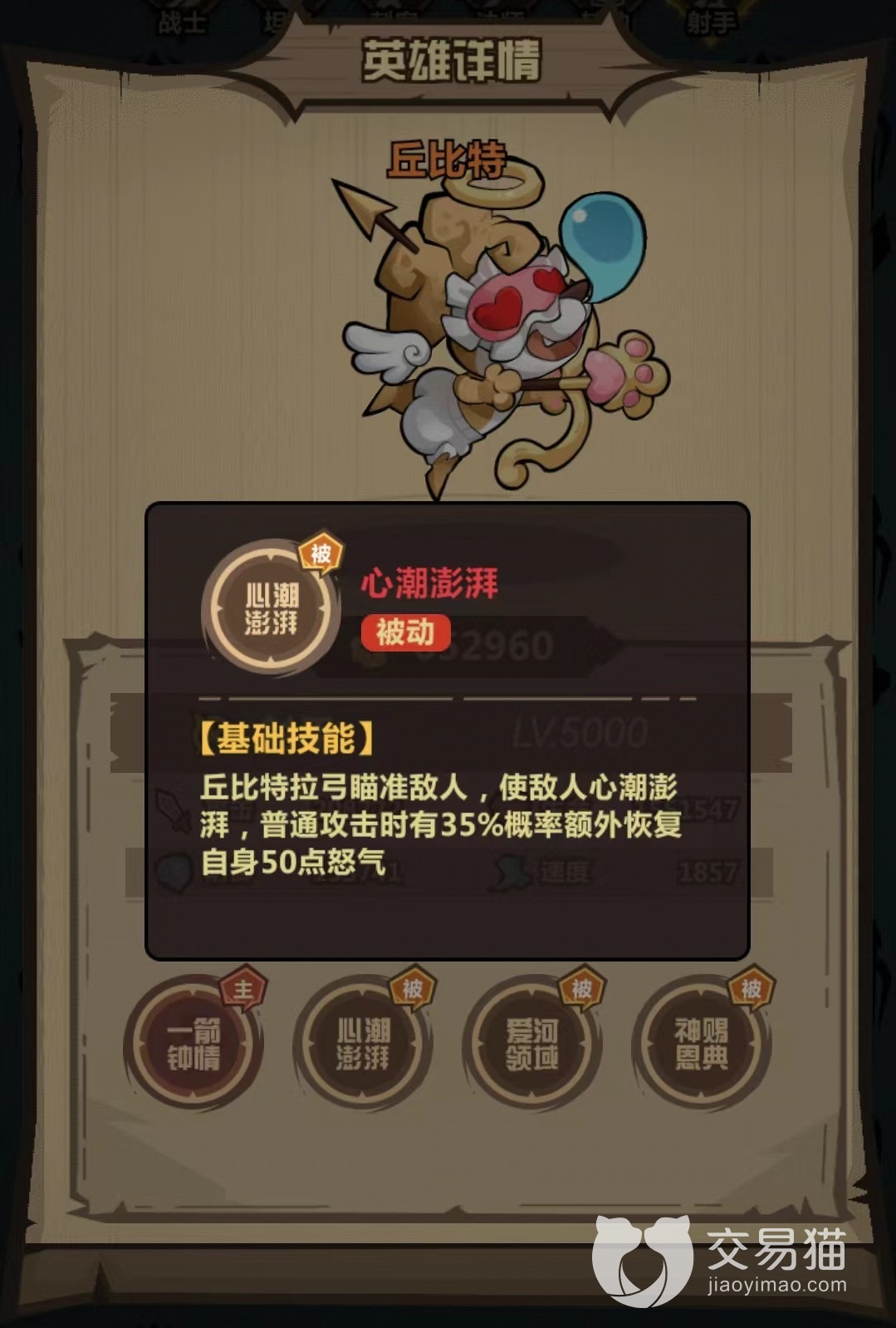 第1个被动心潮澎湃,拉弓瞄准敌人使敌人也心潮澎湃起来,普通攻击时有35%几率额外恢复自身50点怒气。游戏中能够恢复怒气的技能并不算多,丘比特的这一被动效果属于几率比较高的一个。提高了怒气,自然释放主动技能频率就会提高。第2个被动爱河领域,提升该角色30%生命值和20%攻击力,并没有将全部属性都加到输出上面,但提高了生存能力,对后排角色来说也是有帮助的。