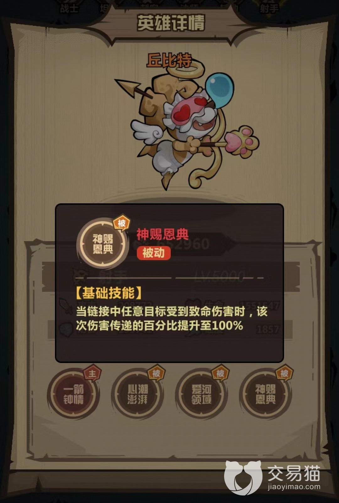 最后一个被动神赐恩典,当主动技能连接起来的两个目标中任意一个受到致命伤害时,该次伤害传递百分比提升至100%。如果运气够好,能够将对方血线压制下来,单凭这一被动就可以将对方连接起来的两名角色全部清除掉。所以丘比特虽然没有技能觉醒效果,但是凭借独特链接也可以打出极其可观的输出。