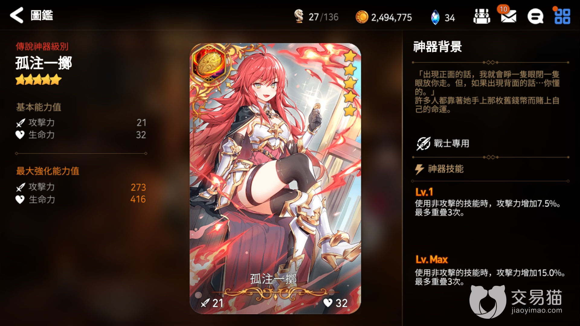 1、孤注一掷:这个就是为其量身打造的神器,可以进一步提升夏娜的攻击。再有就是这个神器的加成效果是不会随着战斗的结束而消失的,因此大家在刷迷宫的时候带这个神器效果就可以一直持续。