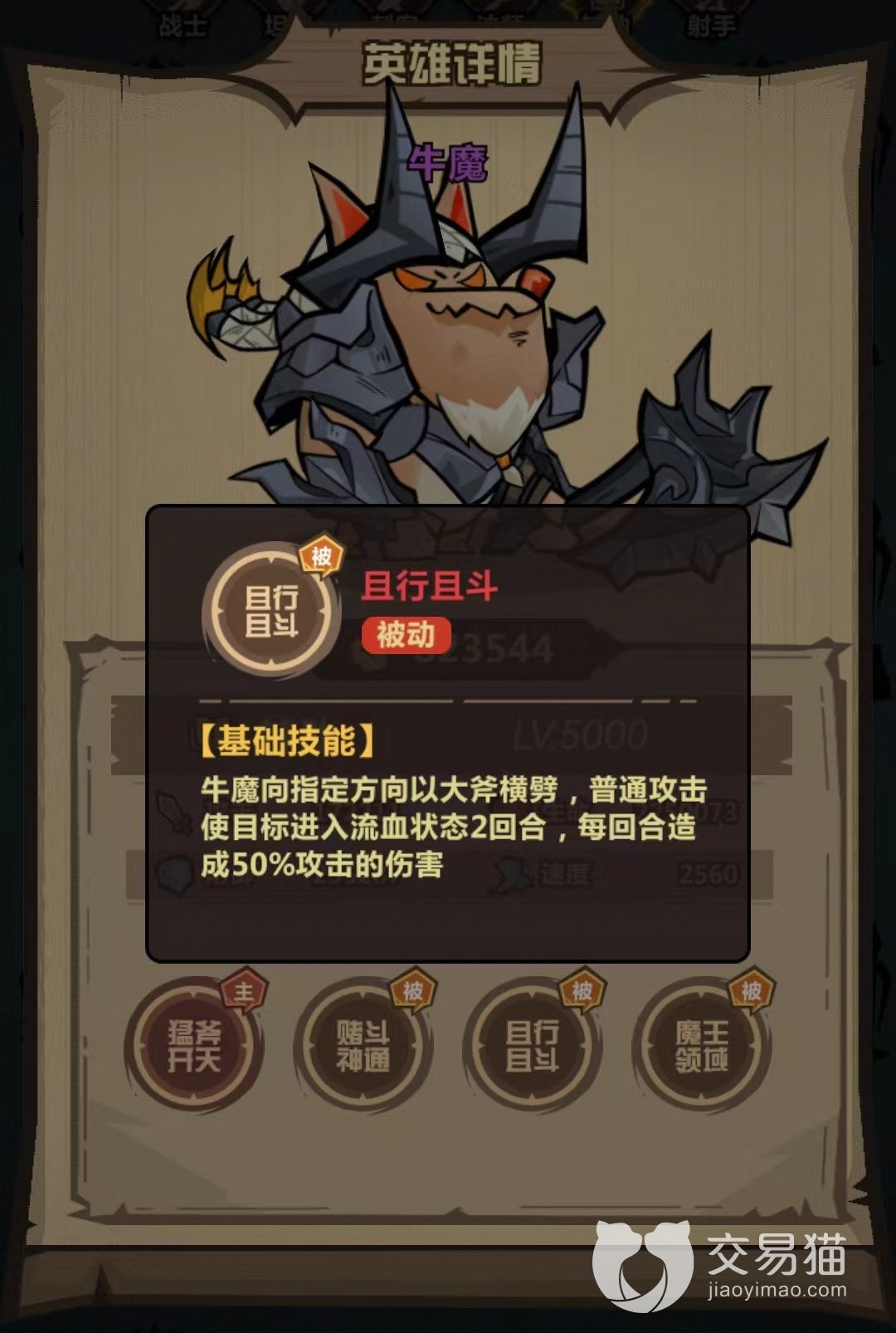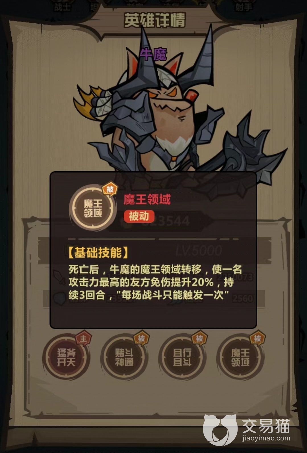 最后一个被动魔王领域,当牛魔死亡之后会将领域进行转移使,一名我方攻击力最高的单位获得百分之二十免伤属性,持续三个回合。这项技能倒是有了辅助的特点,以牺牲自己为代价,为我方输出核心提供了高额免伤。虽然战斗中只能触发一次,而且不能对自己生效,但是依然算是保护友方的一张王牌。所以小编认为该角色在绝大多数时候都会当做肉队使用,但是自身初始只有紫色可能会影响后期属性提升,所以只在前期使用,后期不要再继续培养。
