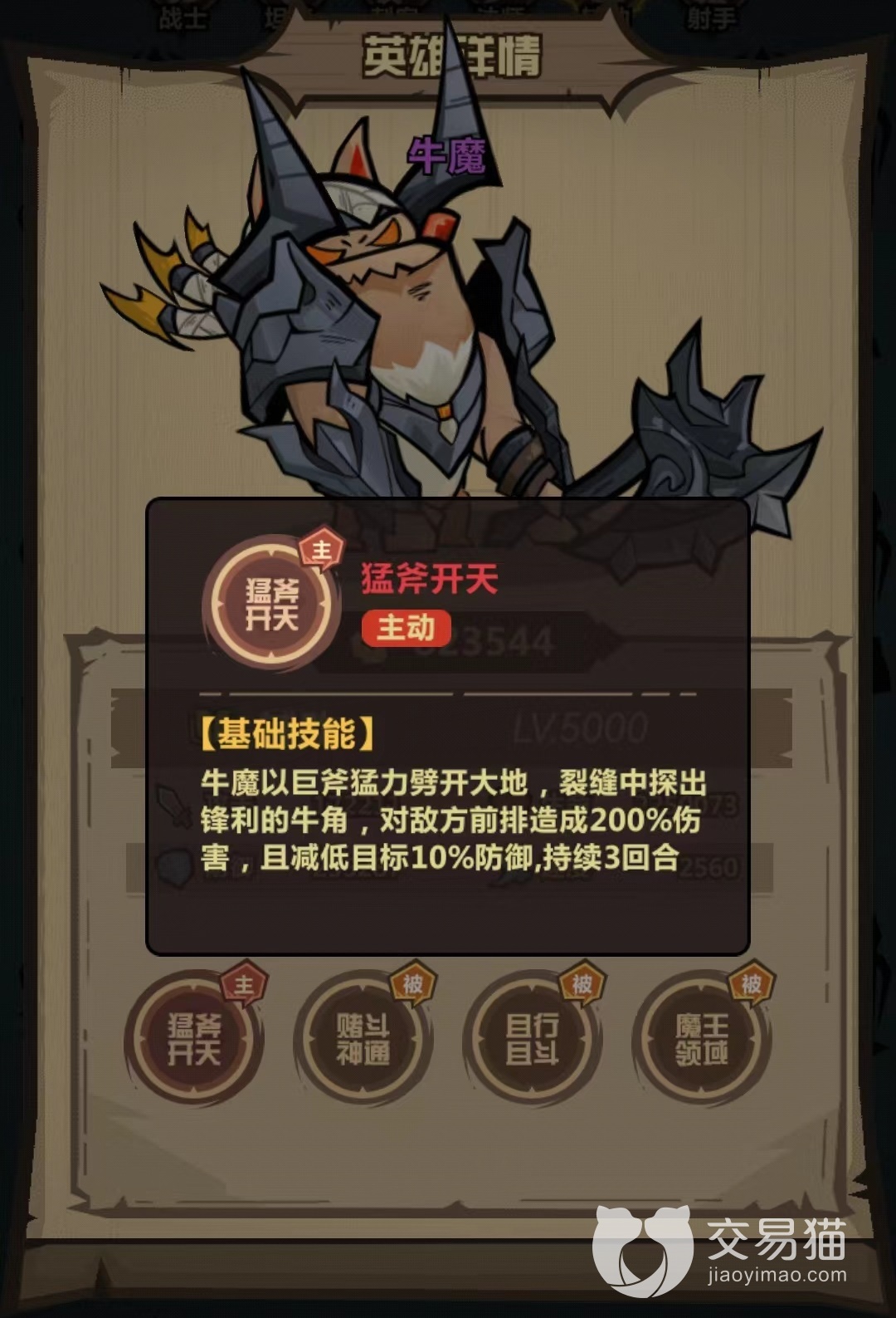 主动技能猛虎开天,挥舞着手中巨斧猛力劈开大地,从裂缝中会出现锋利牛角伤害敌方前排敌人,除了造成200%攻击力数值伤害之外,还会降低伤害目标10%防御,持续三个回合。本来出现在前排的都是比较肉的角色,降低防御之后方便后面队友继续输出,对于快速切掉敌方前排是有帮助的。