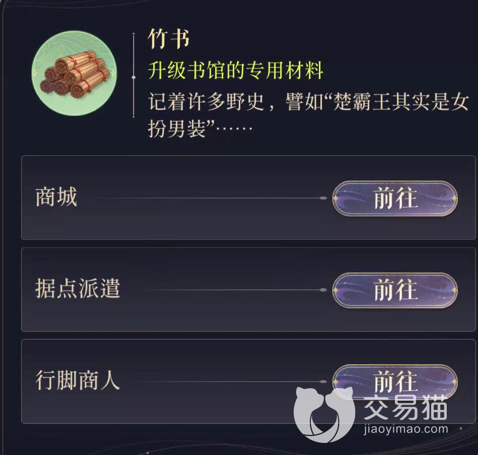 获取竹书的途径有三个:商城、据点派遣、行脚商人。商城直购的竹书售价50白金币5个,比较贵,除非玩家是急用,否则不推荐从这里购买。
